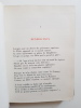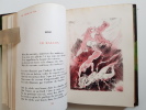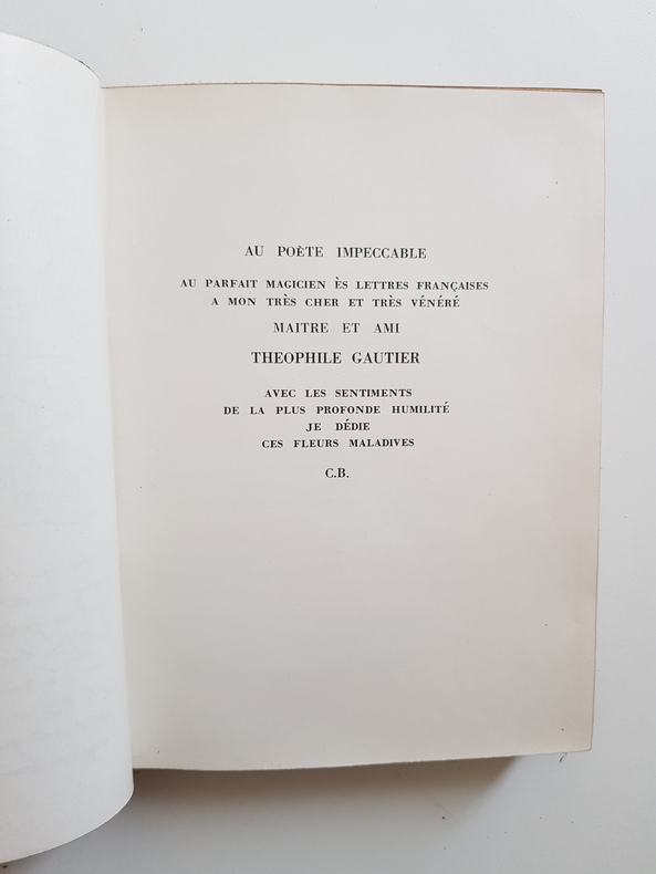 Une illustration art déco des Fleurs du Mal. Un des 10 exemplaires de tête sur Japon Impérial (n° 4), agrémenté d'une aquarelle originale inédite signée intitulée « Épigraphe pour un livre condamné » et d'une suite en noir. Suivent 25 sur vélin avec un dessin original ayant servi à l'édition et une suite en noir, puis 450 exemplaires sur vélin, pour un tirage total de 485 exemplaires. Il est enrichi d'une autre aquarelle rehaussée au crayon de papier datée 1906 vraisemblablement d'une autre main, naïve, et de 3 lettres autographes signées d'André Domin à René Kieffer. Deux en 1918 au sujet de la dimension des pages pour Les Fleurs du mal ainsi que les aléas de la vie d'André Domin et une de 1930 évoquant des comptes financiers à apporter au SPAD. Il est revêtu d'une reliure éditeur à décor à la plaque à froid de fleurs inscrites dans un encadrement losangé (Sanjuan planche LI). L'édition présente 26 illustrations hors-textes au trait, colorées au pochoir avec le titre du poème au-dessous et 52 culs-de-lampes en noir. René Kieffer publie par ailleurs 100 exemplaires d'un tiré-à-part des planches de Domin. André Domin, connu pour avoir fondé avec Marcel Genevrière la maison de décoration d'Avant-garde « Dominique », exaltant la densité du matériau, fut tout d'abord illustrateur de presse et de publicité. Il participa pour les éditions Kieffer à deux ouvrages, Litanies de la Rose de Remy de Gourmont publié en 1919 (Sanjuan p. 666) et Les fleurs du mal de Baudelaire en 1920. Dans un style résolument Art déco, Domin n'hésite pas à moderniser son trait, pour au possible le dépouiller. Recueil de poèmes des plus célèbres, Les fleurs du mal est, dès le début du XXe siècle, un incontournable pour l'édition de luxe. Malgré procès et censure, il est ce jour considéré comme une oeuvre capitale de la poésie moderne. Monod 1075 ; Sanjuan 19 (planches I, II). Dos insolé, quelques légères traces violettes marginales aux pp. 186-187