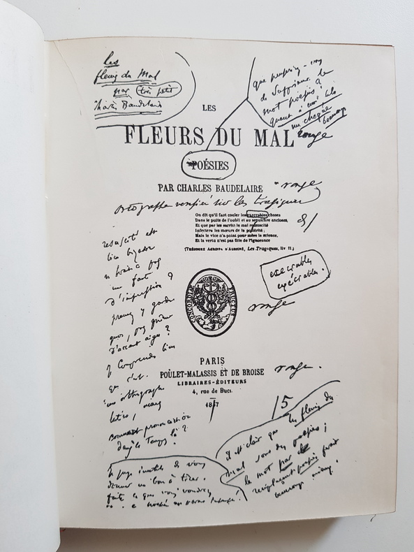 ÉDITION PRÉ-ORIGINALE de XVIII poèmes (pp.1079 à 1093) [NOTE1, in fine], dans lesquels Baudelaire décrit la misérable humanité soumise au Diable : « Sur l’oreiller du mal c’est Satan trismégiste » (I,9), « qui tient les fils qui nous remuent » (I,13) ; ainsi, « Chaque jour vers l’Enfer nous descendons d’un pas » (I,16), toujours en compagnie de Lucifer : « Sans cesse à mes côtés s’agite le Démon » (VI,1), tentateur refoulé avec ses promesses de Paradis artificiel(s) qui « Accoutume ma lèvre à des filtres infâmes » (VI,8). Par ailleurs, pur hasard, coïncidence, éditoriale, voire diabolique, on notera que la première page chiffrée du second volume est frappée du sceau du Malin: "666", nombre satanique par excellence, inspirateur des paradis artificiels, annonciateur des démêlés de Baudelaire avec la « Justice » des hommes ; par la justice « Divine », Baudelaire se sait condamné d’avance [NOTE 2] : « Adorable sorcière, aimes-tu les damnés ? » (VIII, 31). Elucubrations fumeuses de ma part? Ce commentaire méphistophélique a déjà été étudié dans un texte au titre racoleur : Baudelaire’s Satanic Verses , par Jonathan D. CULLER, éminent professeur à la Cornell University [note3] . Jusqu’en 1855, seules quelques poésies éparses avaient été imprimées dans la presse ; dix ans auparavant, Baudelaire pensait donner à son recueil de poésies à venir, ce titre aussi provocateur que sulfureux: « Les Lesbiennes », projet aussitôt dénoncé… même par ses amis. Il fallut donc trouver autre chose : « Les Limbes » aussi furent très vite abandonnées. La « tradition attribue à Hippolyte Babou, écrivain et critique, la trouvaille du nouveau titre », au café Lemblin (ou Lamblin, au Palais Royal), après de longues palabres. Seulement voila : toute mystique entraîne le doute qui, lui-même, conduit à la révision… Bernard Delmay [note4] dénonce l’absence de documents probants et montre que « Les Fleurs du Mal » sont directement issues de la préface de Philippe de Chennevières aux poèmes d’Ernest Prarond ( Impressions et Pensées d’Albert. Paris, Michel Lévy, 1854), dans laquelle il dénonçait « les fleurs étiolées ou impures, d’un parfum affadissant ou malsain ». La paraphrase semble évidente. Ainsi donc disparaîtrait le malheureux Babou, dont c’est, de nos jours, le seul « titre » de gloire ! [NOTE 1] ce recueil est imprimé « à cheval » sur les cahiers 68 et 69 : - feuillet 68/8 [pp. (1079)-1080, titre et premier poème], - feuillets 69/1-7, le poème XVIII (et dernier) recto du septième feuillet (p.1093), le verso (p.1094) occupé par le début de la « chronique de la quinzaine). [NOTE 2] Perdu ! Baudelaire ne sera jamais mis à l’Index. Quoique… Un demi-siècle plus tard, en 1917, les démons de la Censure agitèrent le Vatican : le Saint-Office se pencha sur le cas de quelques auteurs sulfureux, décédés (Baudelaire, bien sûr, Barbey d’Aurevilly, Bloy, Huysmans, Verlaine) ou contemporains (Claudel, Mauriac et même le très catholique Francis Jammes) ; la procédure ne dura que dix ans et aboutit, après une lutte acharnée entre les pro- et les anti- condamnation, le 3 mai 1927, à la publication d’une « Instruction intitulée « De sensuali et de sensuali-mystico litterarum genere » [qui] ne mentionne aucun titre d’ouvrages, aucun nom d’auteur ». On y dénonce le côté immoral des œuvres [empreintes] d’une « sensualité maladive » sans fournir d’exemple » ; ce texte fut traduit dans quelques bulletins diocésains. (d’après Jean-Baptiste Amadieu, in L’année Baudelaire, Paris, Champion, 2018, hal.archives-ouvertes.fr) . [NOTE 3] Diacritics, , volume 28 n°3, 1998, pp. 86-100, publié par The Johns Hopkins University Press. [NOTE 4] in « persee.fr » (Littératures, 1987/ 16 / pp. 115-121) . B. Delmay : Deux notes sur Baudelaire (II-Les Fleurs du mal : Naissance d’un titre).