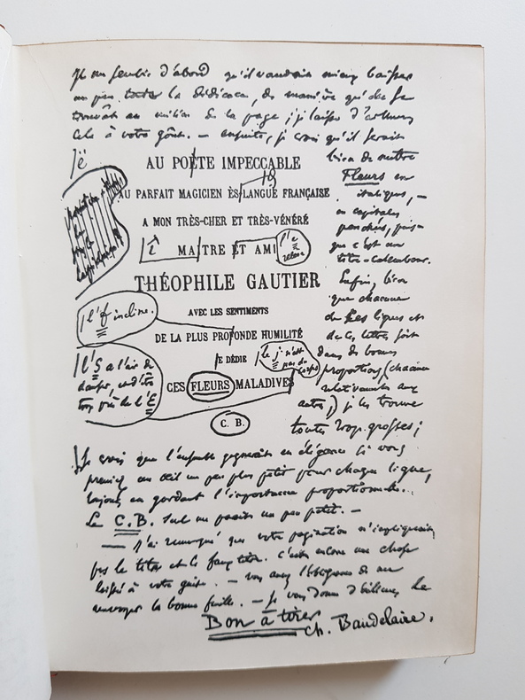 Première édition collective en partie originale, «?extrêmement importante?» selon Clouzot?: «?De plus en plus recherchée, à juste raison, elle comporte en édition originale?: une partie des Fleurs du Mal, les Petits Poèmes en prose, les Curiosités esthétiques (sauf les deux Salons), L'Art romantique (sauf Gautier et Wagner).?» Les Fleurs du Mal est en troisième édition et dernière vouluepar l'auteur en partie originale, à la bonne date de 1868. Vingt-cinq poèmes des Fleurs du Mal paraissent ici pour la première fois, l'édition totalisant à présent 151 poèmes (contre 100 pour l'édition de 1857). Volume 1?: Les Fleurs du Mal, volume 2?: Curiosités esthétiques, volume 3?: L'Art romantique, volume 4?: Petits Poèmes en prose, volume 5?: Histoires extraordinaires, volume 6?: Nouvelles Histoires extraordinaires et volume 7?: Aventures d'Arthur Gordon Pym - Eurêka. Reliures en demi chagrin bordeaux, dos à cinq nerfs ornés de fleurons dorés, plats de papier marbré, gardes et contreplats de papier caillouté, reliures de l'époque. Une très évocatrice lettre autographe de charles Baudelaire citant toutes ses uvres en courssignée «?C. B.?» et adressée à Auguste Poulet-Malassis a été montée sur onglet en tête des Fleurs du Mal. Quatre pages rédigées au crayon de papier sur un double feuillet en date du 13 juin 1859. Cette lettre a été publiée dans Les Lettres (Mercure de France, 1906). Baudelaire écrit de Honfleur à son éditeur, où il se trouve chez sa mère depuis avril 1859. Cette dernière a réservé à son fils deux pièces mansardées de sa maison et la proximité de la mer semble propice au travail?: «?Vous me direz ce que vous pensez de mon Salon. Et de mon Gautier?? Dans peu de temps, je vais pouvoir vous livrer votre Opium et Haschisch, et peu de temps après, les Curiosités complètes, qui seront suivies des Nouvelles fleurs.?» Le poète doit travailler sans relâche pour éponger ses dettes parisiennes et notamment celles contractées auprès du destinataire de cette lettre?: "Puis-je aller à Paris, sans crainte?? Sans inquiétude?? "Je fais allusion au billet de 430 [], et à la promesse de renouvellement que vous m'avez faite à Paris. [] Vous vous brouilleriez avec De Broise, si vous aviez un protêt, et si j'en avais un ici, ma mère me flanquerait à la porte. Or, je veux utiliser jusqu'à la fin de l'année la bonne disposition du travail où je suis.?» Rare et précieux ensemble en reliure uniforme de l'époque de la célèbre première édition des uvres complètes précédée de la longue et belle notice de Théophile Gautier rendant hommage à son disciple «?impeccable?», enrichi d'une belle lettre autographe dans laquelle l'Albatros évoque ses principales uvres. - Photographies et détails sur www.Edition-Originale.com -