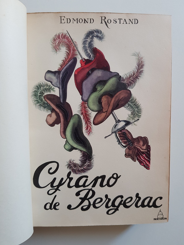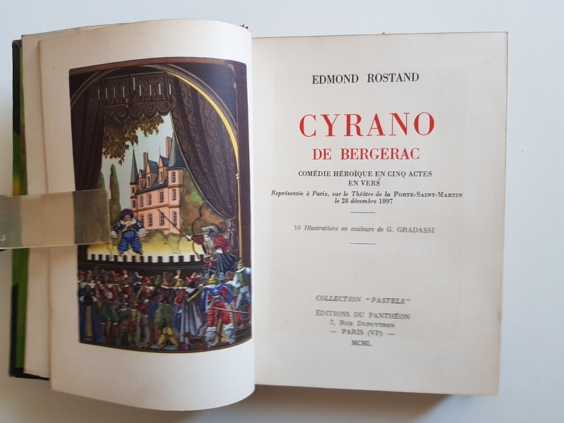 Titre : Cyrano de Bergerac Auteur : Rostand Edmond Illustrateur : Gradassi G. Éditeur : Éditions du Panthéon Lieu : Paris Date : 1950 Collection : Pastels Édition : Édition illustrée Tirage : Tirage limité à 4 000 ex. (200 sur Johannot pur fil numérotés 1‑200 et 3 800 sur vélin Johannot d’Annonay numérotés 201‑4 000) ; exemplaire n° 304 Reliure : Demi‑basane brune à coins, dos à nerfs, plats papier marbré vert ; tranchefiles Langue : Français Dimensions : env. 20 x 15 cm Description : Comédie héroïque en cinq actes en vers, représentée à Paris le 28 décembre 1897. Belle édition des Éditions du Panthéon, avec 10 illustrations en couleurs de G. Gradassi et une page de titre illustrée. Papier vélin Johannot d’Annonay. Colophon portant le dépôt légal 2e trimestre 1950 (OPL 10.857) et la numérotation manuscrite/imprimée de l’exemplaire. Reliure artisanale solide ; coiffes et coins émoussés, frottements au dos, légères usures d’usage ; intérieur propre et frais.