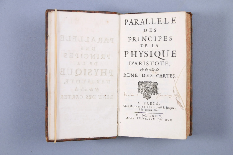 LE BOSSU, René (1631-1680). Parallèle des principes de la physique d'Aristote, et de celle de René Descartes.. Paris, Michel Le Petit. 1674 In-12, (6ff), 319 pages. Veau du temps. (Coiffes et coins frottés. Petit découpage dans la marge de gouttière du titre, sans doute pour enlever un ex-libris.).