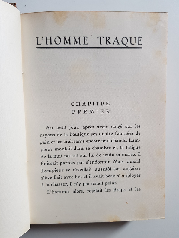 Titre : L'Homme traqué Auteur : Carco Francis Éditeur : Albin Michel Lieu : Paris Date : 1929 Illustrations : Jacques Lechantre - illustrations en couleurs Reliure : Demi-basane brune, dos à nerfs orné du titre doré, plats papier marbré vert État : Bon état d'usage - dos et coiffes légèrement frottés, plats tachés, rousseurs éparses, intérieur solide Description : Édition illustrée des Éditions Albin Michel. Mention de copyright 1922. Achevé d'imprimer le 18 décembre 1929 par les Établissements Busson, 117, rue des Poissonniers, Paris. Beau roman de Francis Carco, ici accompagné de compositions en couleurs de Jacques Lechantre. Exemplaire en demi-reliure ancienne, bon maintien, papier avec quelques rousseurs. Langue : Français