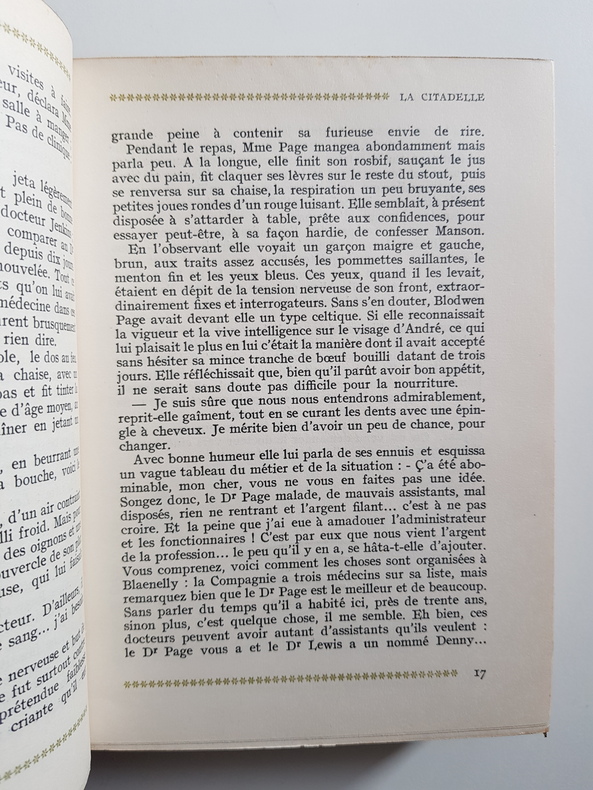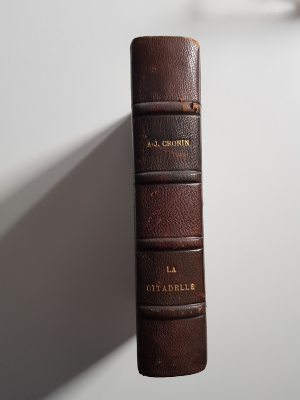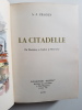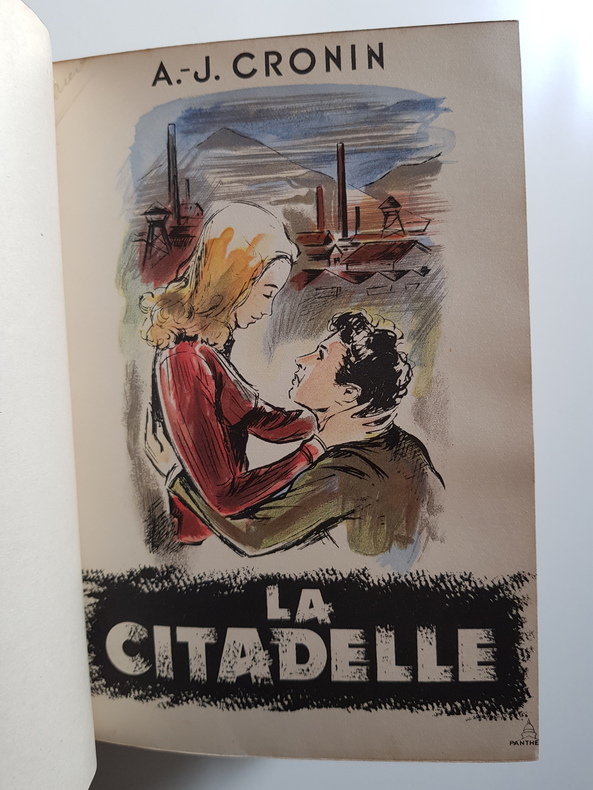 Titre : La Citadelle Auteur : Cronin A. J. Éditeur : Éditions du Panthéon Lieu : Paris Date : 1951 Collection : Pastels Illustrations : 10 illustrations en couleurs de Pierre Leroy Tirage : Exemplaire numéroté 470 sur vélin chiffon Johannot d'Annonay, tirage total 3 500 ex. (dont 200 sur pur fil Johannot numérotés I à 200) Reliure : Demi-cuir à coins, dos à nerfs, titre doré, plats papier marbré vert Langue : Français Format : In-8, env. 19 x 14 cm État : Bon exemplaire, reliure solide avec frottements d'usage et petite marque au dos, intérieur propre et bien frais Description : Édition illustrée de ‘La Citadelle', célèbre roman d'A. J. Cronin, parue dans la collection ‘Pastels' des Éditions du Panthéon. Jolie impression sur papier Johannot, avec un frontispice et neuf autres planches en couleurs de Pierre Leroy. Exemplaire numéroté.