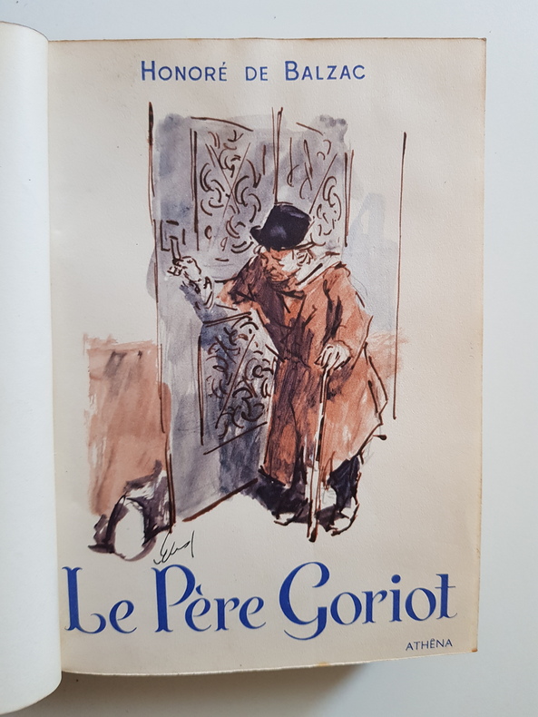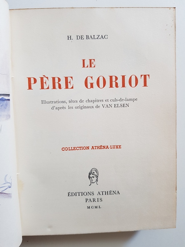 Titre : Le Père Goriot Auteur : Balzac Honoré de Éditeur : Éditions Athéna Lieu d'édition : Paris Collection : Athéna-Luxe Date : 1950 Illustrateur : Van Elsen Tirage : 500 ex. sur Annam numérotés 1-500 et 4 500 ex. sur vélin numérotés 501-5 000 Numéro d'exemplaire : 557 (sur vélin) Langue : Français Format : in-8, env. 22 x 17 cm Reliure : Demi‑basane brune à coins, dos à nerfs, titre doré, plats papier marbré vert État : Frottements d'usage, petits manques aux coiffes et aux coins, mors légèrement fatigués ; intérieur propre avec bords légèrement brunis Description : Belle édition illustrée du grand roman de la Comédie humaine. Frontispice en couleurs et nombreuses illustrations in‑texte, têtes de chapitres et culs‑de‑lampe d'après les originaux de Van Elsen. Exemplaire numéroté, tirage Athéna‑Luxe, relié à l'époque.