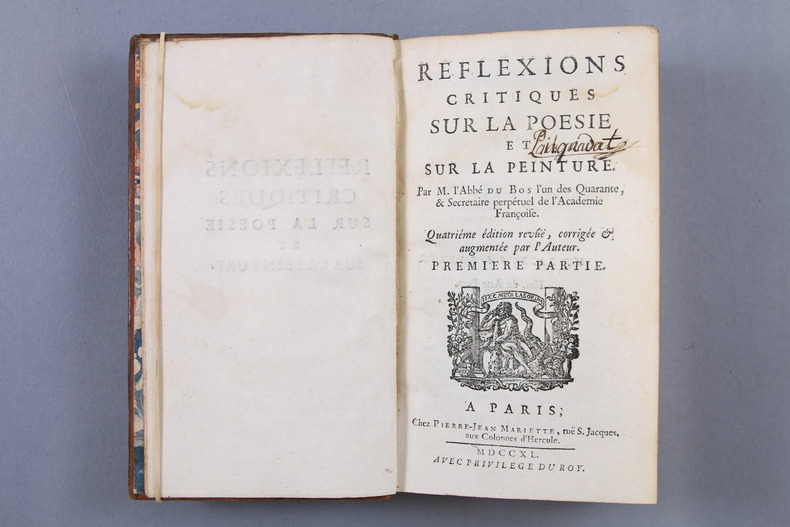 Célèbre par sa passion de l'opéra et son goût du luxe, négociateur de la paix d'Utrecht, Dubos fut conseiller du cardinal Dubois et de Voltaire. Il appliqua son esprit critique à l'histoire et à l'esthétique. Parues pour la première fois en 1719 et souvent rééditées, les Réflexions critiques sur la poésie et sur la peinture ont marqué un tournant dans la pensée esthétique et exerceront une influence considérable sur le développement de l’art théâtral et de la musique tout au long du siècle des Lumières. S'inscrivant dans le fil de la querelle des Anciens et des Modernes, ces Réflexions tentent d'expliquer les productions artistiques à partir du climat, du milieu et de l'époque. Dubos montre que le sentiment joue en art un rôle aussi important que la raison, car l'art doit « toucher ». Il insiste sur le « sixième sens » intervenant en matière esthétique, mêlant sentiment et sentimentalité. Ces Réflexions sont le fondement d'une nouvelle esthétique de la perception, faisant du sentiment un critère de jugement et ouvrant ainsi la voie à la critique moderne. Tampon Roland Couvreu en pages de garde. Bel exemplaire.