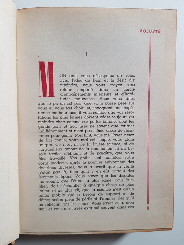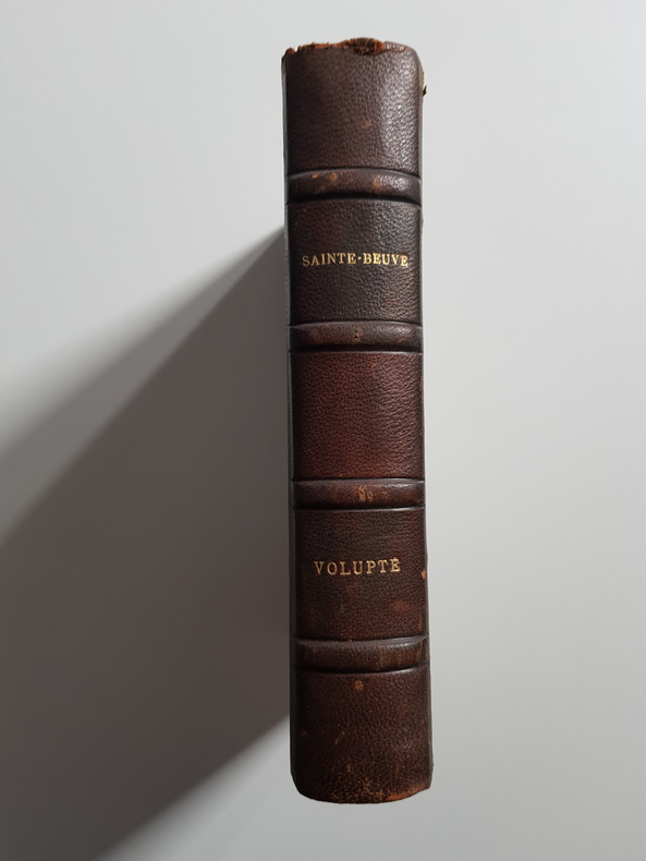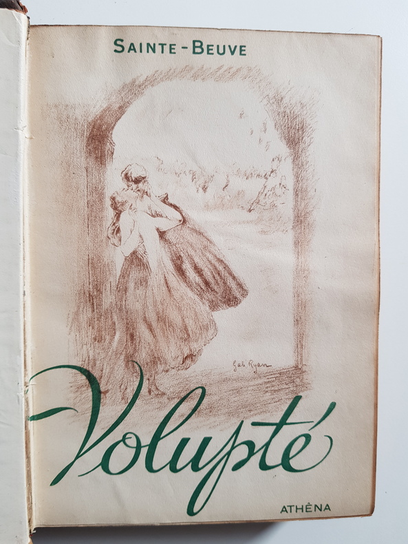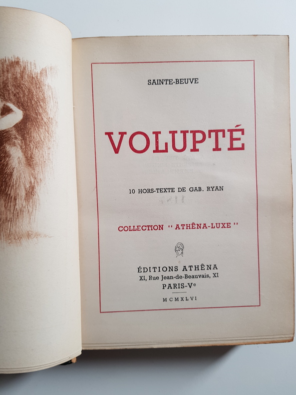 Titre : Volupté Auteur : Sainte-Beuve Charles-Augustin Illustrations : Gab. Ryan (10 hors-texte) Éditeur : Éditions Athéna Collection : Athéna-Luxe Lieu : Paris Date d'édition : 1946 Format : In-8 Reliure : Demi-cuir à coins, dos à nerfs titré or, plats de papier marbré vert Langue : Français Tirage : 2000 exemplaires numérotés. Exemplaire n° 1187 Description : Belle édition de la collection Athéna-Luxe, illustrée de 10 hors-texte de Gab. Ryan. Impression soignée, typographie en rouge et noir, lettrines et culs-de-lampe État : Frottements d'usage, coiffe supérieure émoussée avec petit manque, coins émoussés, plats avec décolorations ; papier uniformément jauni avec quelques rousseurs éparses. Reliure solide, intérieur propre