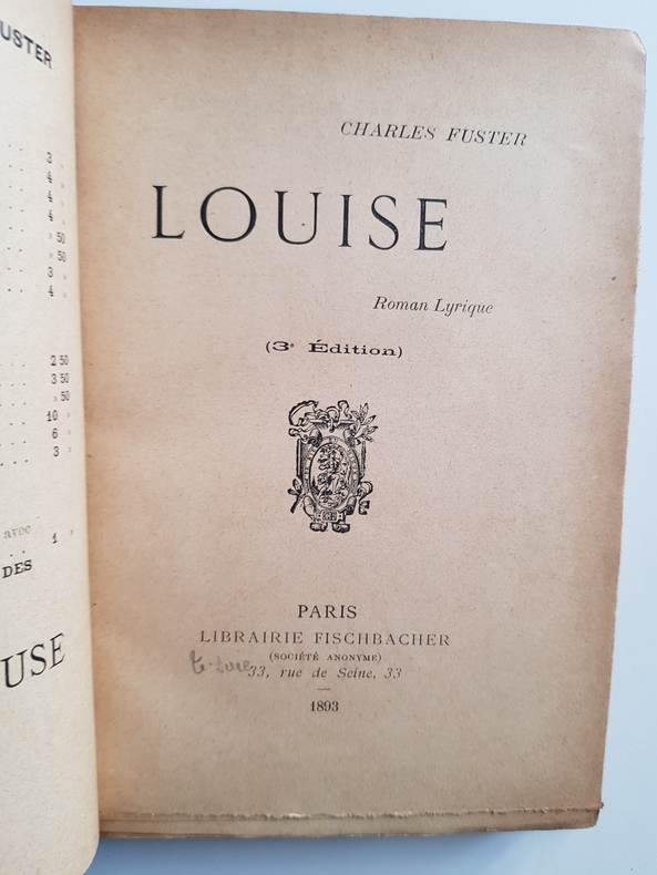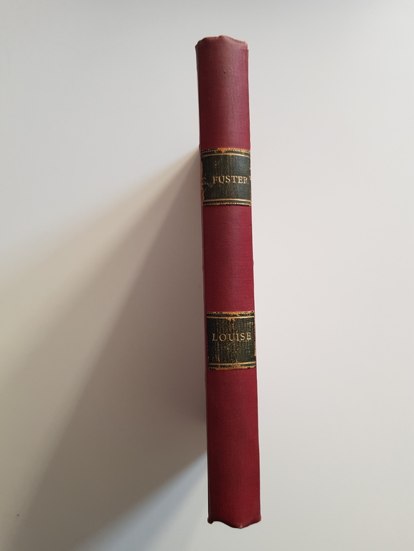 Titre : Louise - Roman lyrique Auteur : Fuster Charles Lieu : Paris Éditeur : Librairie Fischbacher (Société anonyme), 33 rue de Seine Date : 1893 Édition : 3e édition Reliure : Demi-toile rouge à coins, plats marbrés, dos lisse avec deux pièces de titre noires dorées Format : env. 18 x 12 cm Langue : Français Provenance : Ex libris gravé de Pierre Huguenin au contreplat ; envoi autographe signé de l'auteur sur feuillet de garde « Exemplaire de Pierre Huguenin. Ch. Fuster » Description : Roman lyrique en vers ouvrant sur le chapitre « L'hiver terrible », situé dans le Jura. Vignette typographique au titre. Papier uniformément bruni avec quelques rousseurs, solide exemplaire en reliure privée soignée.