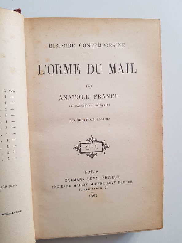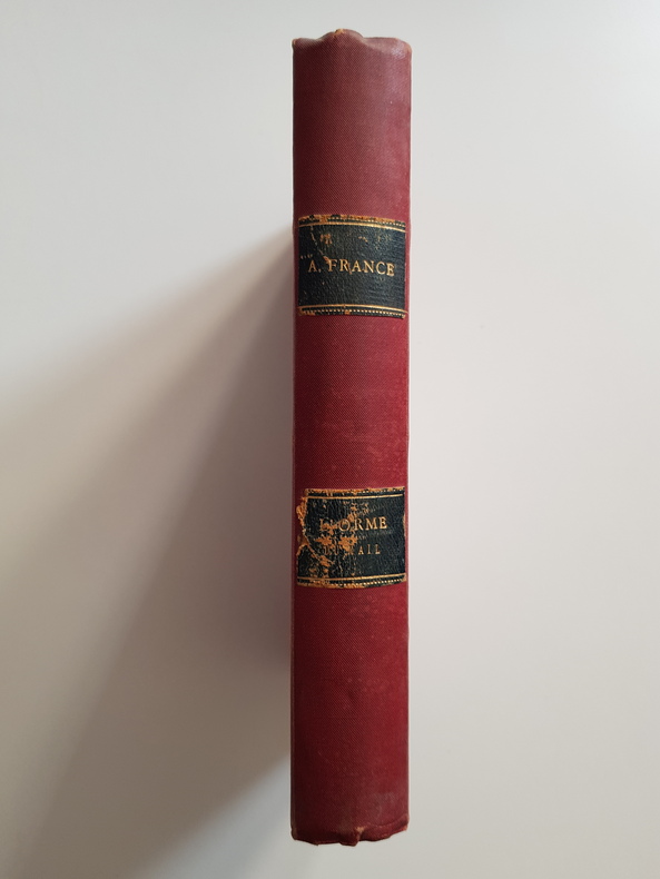 Titre : L'Orme du Mail Auteur : France Anatole Éditeur : Calmann Lévy, éditeur – Ancienne Maison Michel Lévy Frères Lieu : Paris Date : 1897 Édition : Dix-septième édition Collection : Histoire contemporaine Reliure : Demi-toile rouge d'époque à coins, dos lisse avec pièces de titre noires et dorées, plats marbrés Langue : Français Provenance : Ex-libris imprimé de Pierre Huguenin contrecollé sur le contreplat État du livre : Bon état d'usage – dos et pièces de titre frottés, coins et coiffes légèrement émoussés, papier uniformément jauni avec rousseurs éparses, intérieur solide Description : Roman d'Anatole France ouvrant le cycle Histoire contemporaine, tableau satirique de la Troisième République dans une ville de province, où l'abbé Guitrel et les notables se livrent aux intrigues politiques et religieuses. Exemplaire de lecture agréable dans une reliure demi-toile marbrée de l'époque, complet de son titre daté 1897, avec un intéressant ex-libris de collectionneur.
