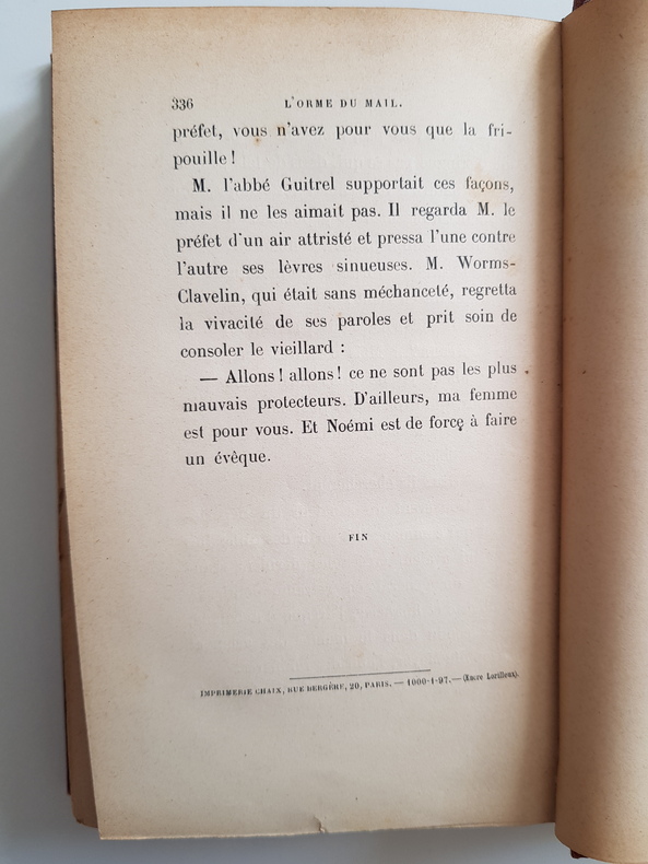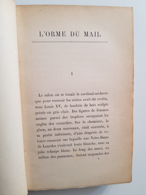 Premier des quatre volumes qui forment L'histoire contemporaine avec Le mannequin d'osier, L'anneau d'améthyste, et M. Bergeret à Paris, constitue l'ouverture dune série romanesque où la fiction a pris ses sources dans la société française au seuil du XXe siècle. Chronique de la vie provinciale, L'orme du mail offre, grâce à l'abbé Lantaigne et à l'abbé Guitrel, grâce au général Caftier de Chalmot, au préfet Worms-Clavelin, au président Cassignol, à M. de Gromance, auxquels, il faut joindre plusieurs visages féminins, un tableau satirique de l'Eglise, de l'Armée, de l'Administration, de la justice et de la Noblesse. Cependant, sous l'orme vénérable du mail, discourt subtilement Lucien Bergeret, maître de conférences à la faculté des Lettres, tenu pour « un esprit distingué, mais bizarre... imprudent en paroles », malheureux. dans son ménage, où il goûte « à l'excès les incommodités de la vie commune ». Sous le couvert du sourire, Anatole France a tracé une fresque d'une vérité assez impitoyable, où les caractères sont sans cesse confrontés aux apparences sociales. La nomination d'un évêque au siège de Tourcoing et les rivalités qu’elle provoque - argument auteur duquel se développe le récit - ont permis au chroniqueur de L'histoire contemporaine de mettre en relief plusieurs figures de prêtres qui rivalisent avec les meilleures soutanes de Stendhal et de Balzac Vol in-8, 180x140, superbe reliure demi cuir, tranche de tête dorée, bont état intérieur, 336pp. Couvertures d'origines conservées. Paris Calman Lévy, 1897 ref/C29
