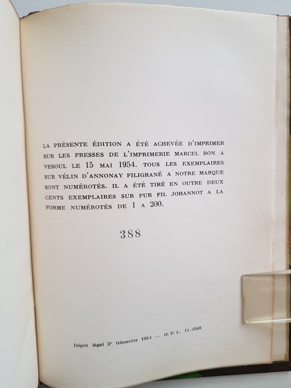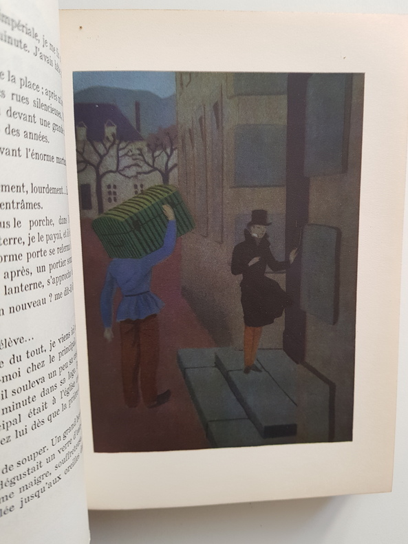 Titre : Le Petit Chose Auteur : Daudet Alphonse Illustrateur : Chopy Claude Éditeur : Éditions du Panthéon Lieu : Paris Collection : Pastels Date d'édition : 1954 Achevé d'imprimer : 15 mai 1954, imprimerie Marcel Bon, Vesoul Tirage : Exemplaire numéroté 388 sur vélin d'Annonay filigrané ; en outre, 200 exemplaires sur pur fil Johannot numérotés 1 à 200 Reliure : Demi-basane brune à coins, dos à nerfs et titre doré, plats de papier marbré vert Illustrations : 10 planches en couleurs de Claude Chopy, vignettes et lettrines Format : In-8 Particularités : Marque de l'éditeur au titre ; mention de dépôt légal 2e trimestre 1954 État : Frottements et petites épidermures au dos, coiffes et coins émoussés, quelques taches et décolorations sur les plats ; intérieur propre avec rares rousseurs, planches en couleurs bien fraîches