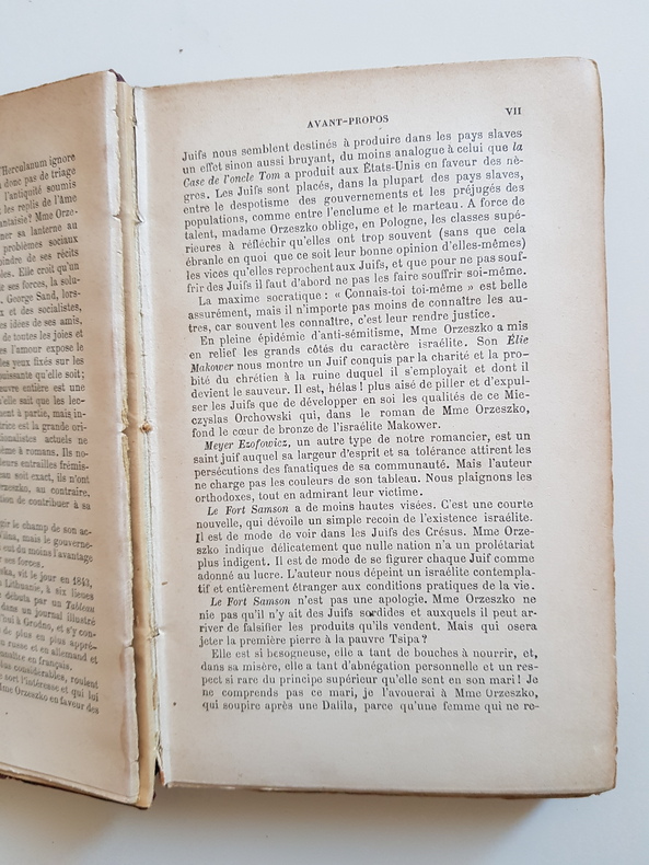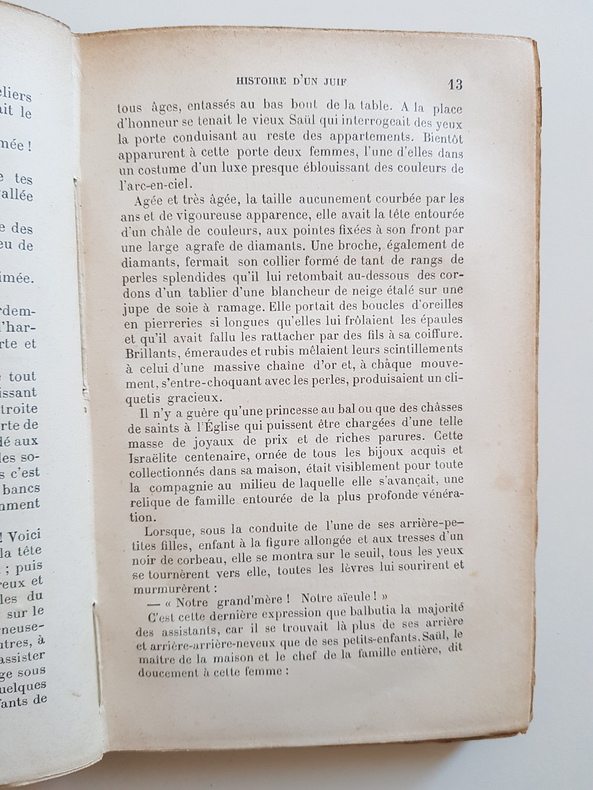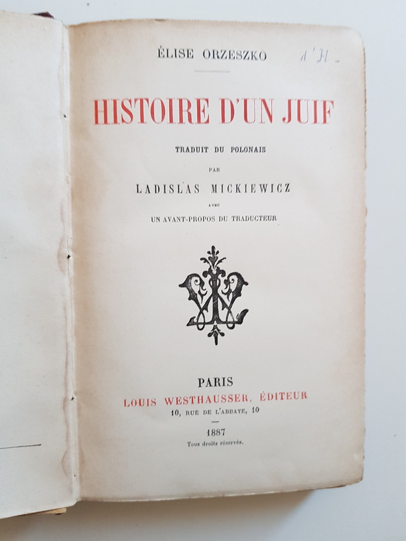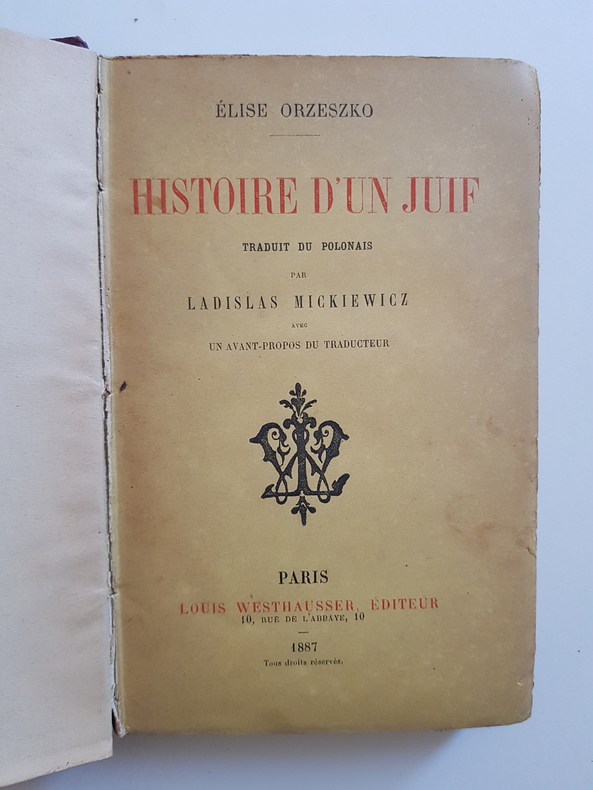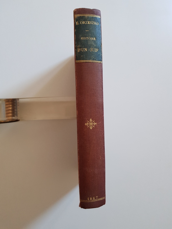 Titre : Histoire d'un Juif Auteur : Orzeszko Élise Traducteur : Mickiewicz Ladislas Lieu d'édition : Paris Éditeur : Louis Westhausser, éditeur (10, rue de l'Abbaye) Date d'édition : 1887 Langue : Français (traduit du polonais, avec un avant-propos du traducteur) Reliure : Demi-toile bordeaux de l'époque, plats papier marbré, pièce de titre verte au dos, titre et filets dorés, fleuron doré, date en pied Format : env. 18,5 x 12 cm État : Bon exemplaire d'époque. Usure d'usage aux plats et aux coins, mors solides mais charnières internes partiellement fendillées en début d'ouvrage ; papier uniformément jauni avec rousseurs éparses ; petite éraflure en tête du plat supérieur. Intérieur complet, impression nette. Description : Première édition française chez Westhausser d'un roman majeur d'Élise Orzeszko qui s’intéresse à la condition juive en Pologne au XIXᵉ siècle et aux tensions entre la communauté juive et la société environnante. Traduction par Ladislas Mickiewicz, précédée d'un substantiel avant-propos du traducteur. Vignette typographique à la page de titre.
