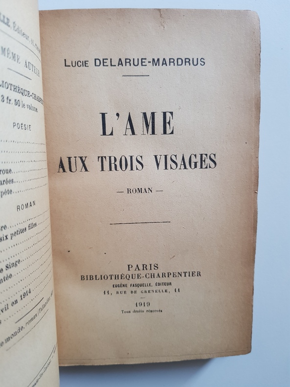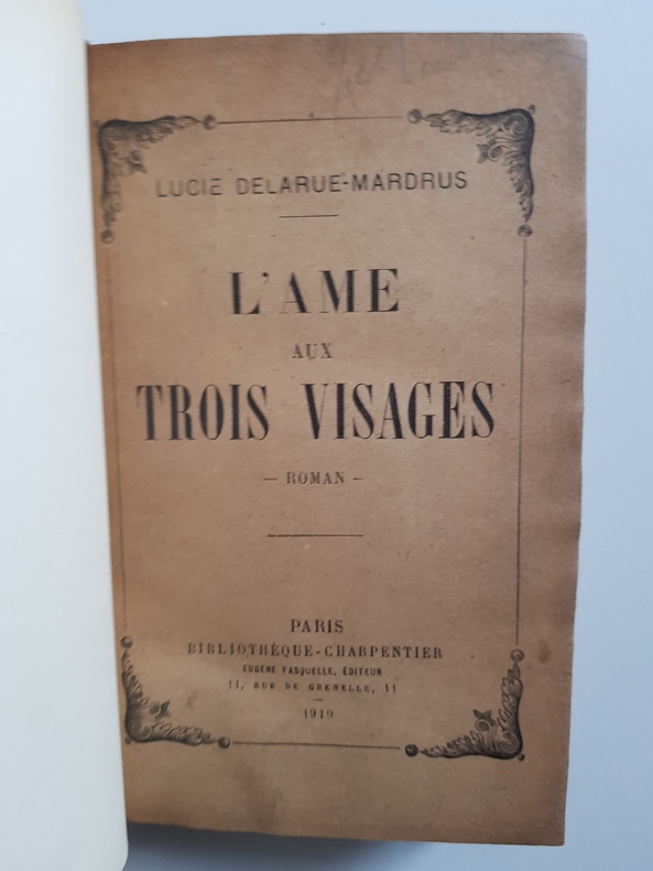 Titre : L'Âme aux trois visages Auteur : Delarue-Mardrus Lucie Lieu : Paris Éditeur : Bibliothèque-Charpentier - Eugène Fasquelle, éditeur Date : 1919 Collection : Bibliothèque-Charpentier Reliure : Demi-maroquin rouge, plats marbrés, dos à nerfs avec titre doré, tranchefile et petit signet Langue : Français Imprimeur : Saint-Germain-lès-Corbeil, Imp. Willaume Particularités : Exemplaire enrichi d'une longue dédicace autographe signée de l'autrice sur le faux-titre Description : Roman de Lucie Delarue-Mardrus publié chez Fasquelle dans la collection Bibliothèque-Charpentier. Bel exemplaire en demi-maroquin d'époque. Papier jauni, rousseurs éparses, petite trace d'usage au dos et légères marques en marges, sinon bien conservé.