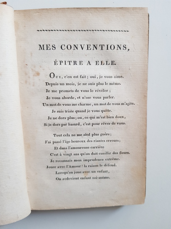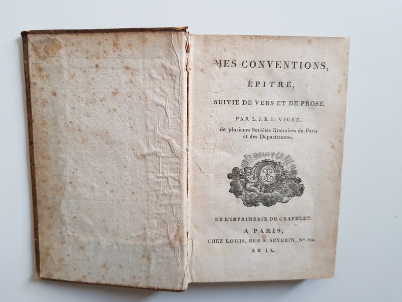 Titre : Mes conventions, épître, suivie de vers et de prose Auteur : Vigée, Louis-Jean-Baptiste-Étienne Lieu : Paris Éditeur : Chez Louis, rue Saint-Severin, no 120 – De l'imprimerie de Crapelet Date : An IX - 1801 Format : In-12 (env. 16 x 10 cm) Reliure : Demi-basane brune d'époque, dos lisse orné de filets dorés et pièce de titre « MES CONVEN », plats papier marbré Illustrations : Vignette gravée au titre et 1 planche gravée hors-texte Langue : Français Description : Rare recueil poétique de L.-J.-B.-E. Vigée. Le volume s'ouvre sur l'épître « À elle », suivi de pièces en vers et en prose, parmi lesquelles « Ariane abandonnée », etc. Intéressant témoin de la production littéraire sous le Consulat, imprimé par Crapelet et publié chez Louis, rue Saint-Severin. Exemplaire ancien avec rousseurs éparses, usure d'usage à la reliure, intérieur globalement propre et solide.
