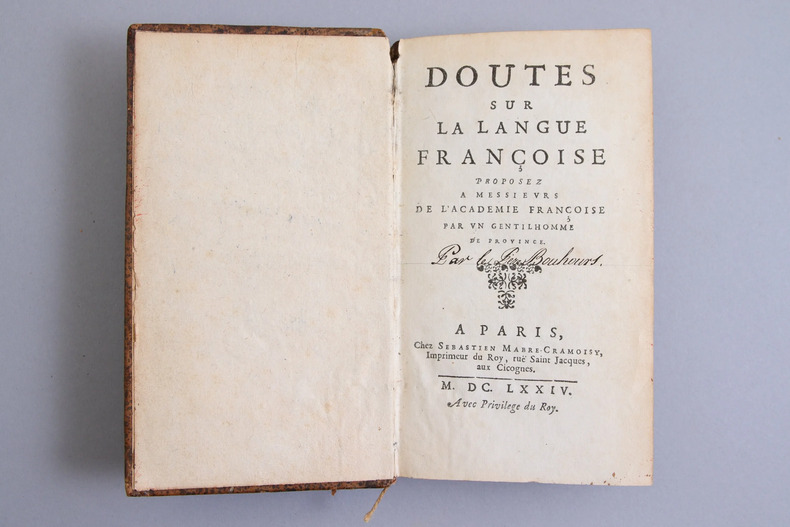 Doutes sur la langue françoise proposée à Messieurs de l'Académie Françoise par un gentilhomme de province. Seconde édition.. Paris, Sébastien Mabre-Cramoisy. 1682 In-12. Veau du temps. Tranches mouchetées. (Coiffe supérieure endommagée ; coins frottés).. Troisième édition, avec mention de seconde édition. BOUHOURS, Dominique (1628-1702).