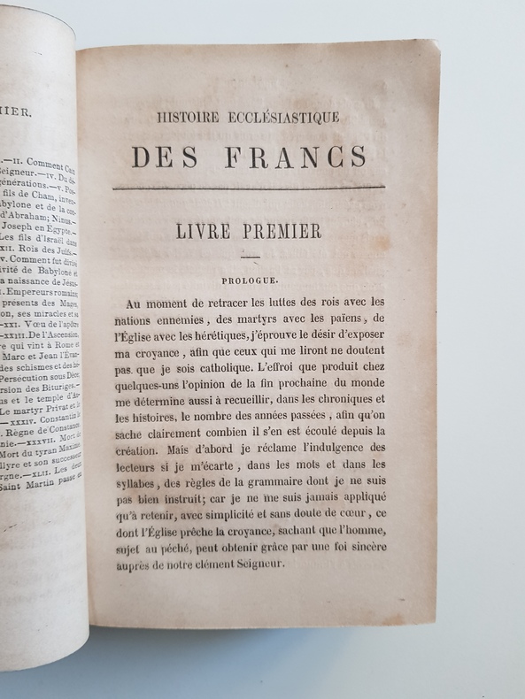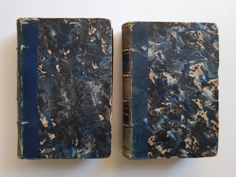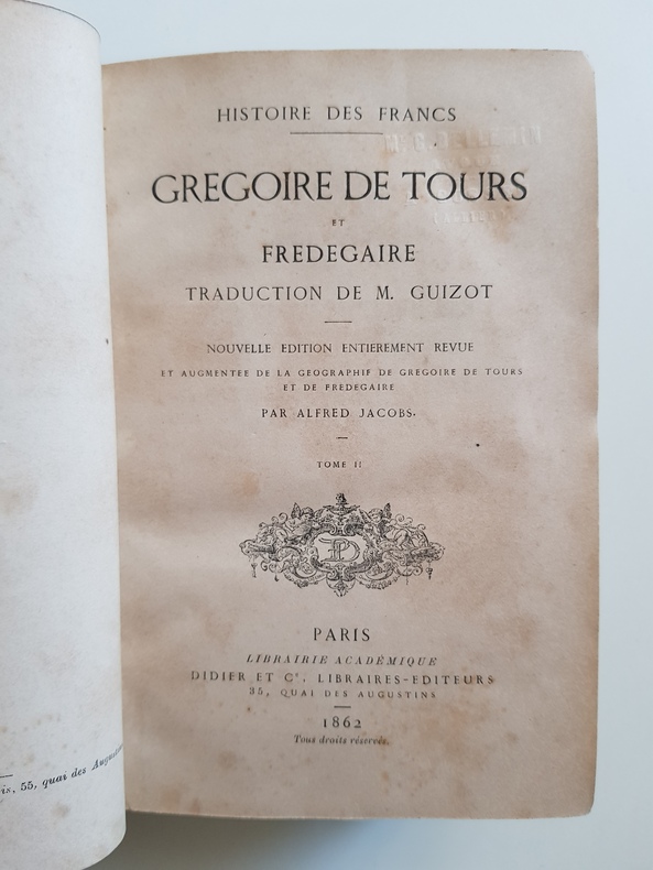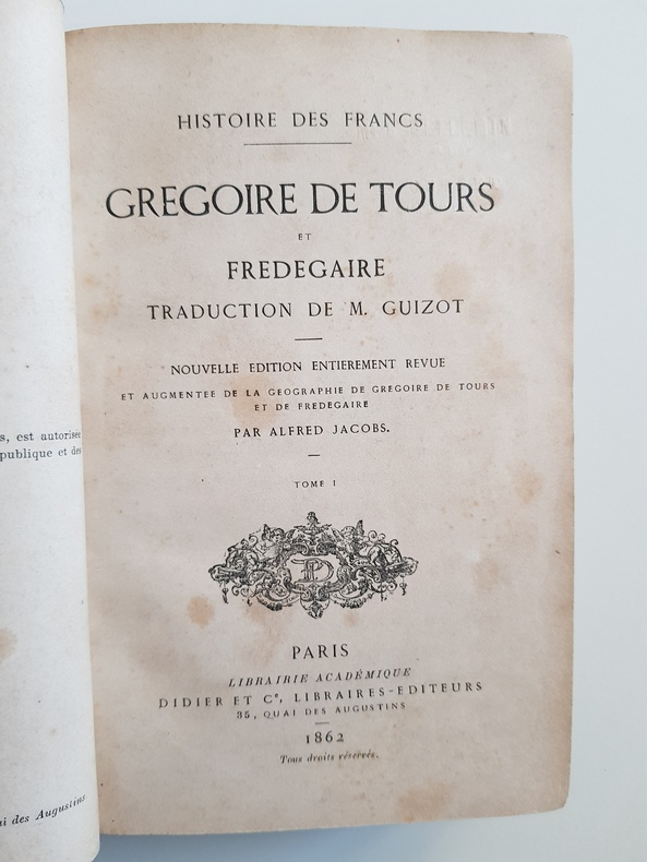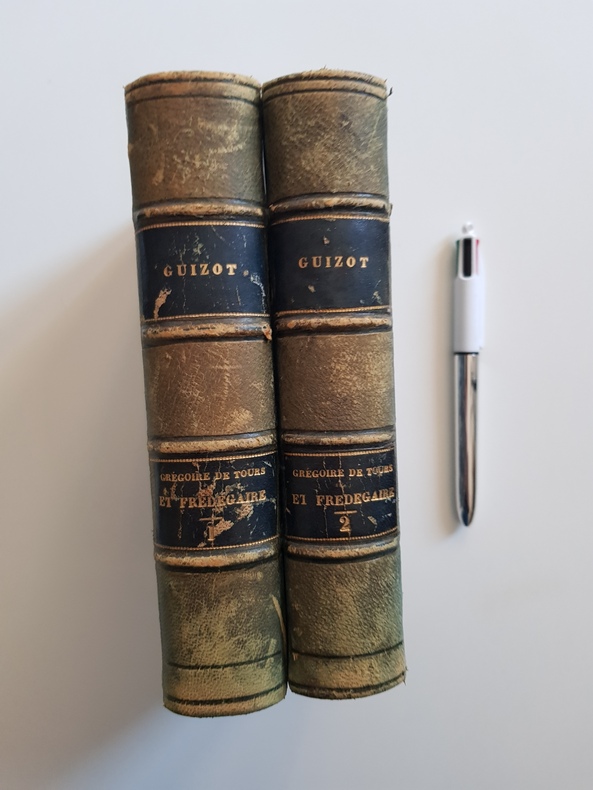 Titre : Histoire des Francs. Grégoire de Tours et Frédégaire Auteur : Tours, Grégoire de - Frédégaire Traducteur : Guizot, François Contributeur : Jacobs, Alfred (révision et augmentations) Édition : Nouvelle édition entièrement revue et augmentée de la Géographie de Grégoire de Tours et de Frédégaire Lieu : Paris Éditeur : Librairie académique Didier et Cie, libraires‑éditeurs, 35, quai des Augustins Date : 1862 Volumes : 2 tomes (Tome I et Tome II) Reliure : Demi‑basane verte d'époque, dos lisses ornés de filets dorés et pièces de titre noires, plats marbrés Format : in‑12, env. 18 × 12 cm Langue : Français État : Usure d'usage aux reliures (frottements, coins émoussés), coiffes et mors solides ; rousseurs éparses ; cachet à sec ancien sur les pages de titre. Ensemble bien complet des deux volumes. Contenu : Traduction classique par Guizot de l'Histoire des Francs de Grégoire de Tours et de la Chronique dite de Frédégaire, précédée de l'Histoire ecclésiastique des Francs ; édition revue et augmentée par Alfred Jacobs avec une géographie des deux chroniques.