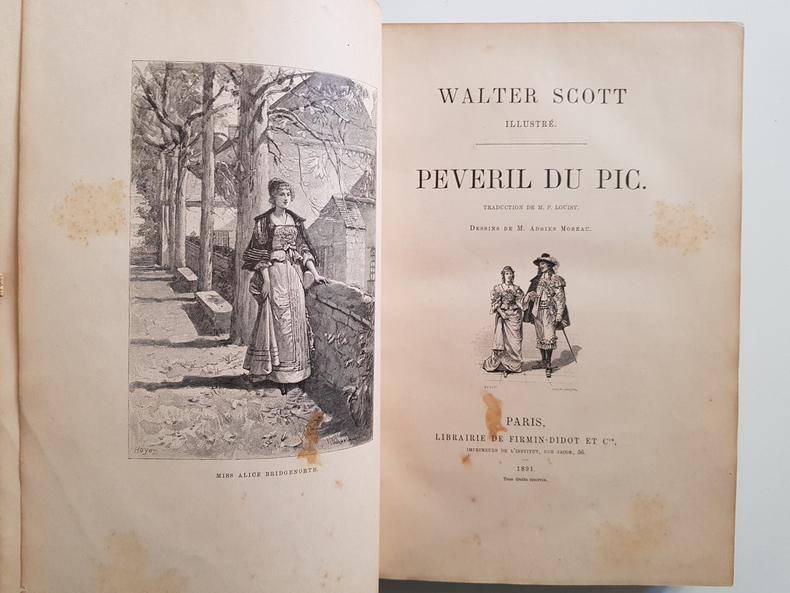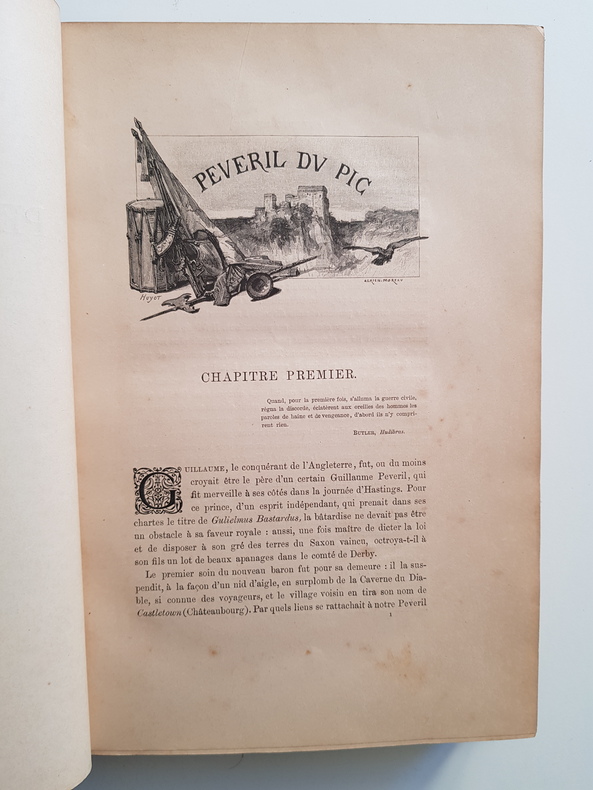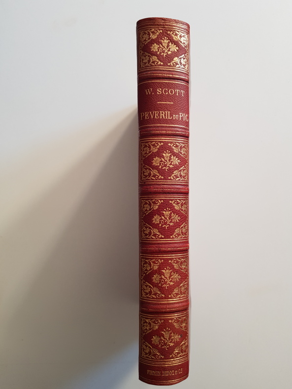Titre : Peveril du Pic Auteur : Scott Walter Traducteur : P. Louisy Illustrateur : Adrien Moreau Collection : Walter Scott illustré Éditeur : Librairie de Firmin-Didot et Cie Lieu : Paris Date d'édition : 1881 Langue : Français Format : Grand in-4 Reliure : Demi chagrin rouge à coins, dos à nerfs orné de compartiments et fers dorés, titre doré, plats marbrés Description de l'exemplaire : Édition française illustrée de nombreuses gravures sur bois hors texte et dans le texte d'après Adrien Moreau. Jolie reliure de l'époque, dos richement décoré. Rousseurs éparses, quelques taches plus marquées aux premières pages et sur la page de titre ; infimes frottements d'usage aux plats. Intérieur bien conservé, impression soignée de Firmin-Didot.
