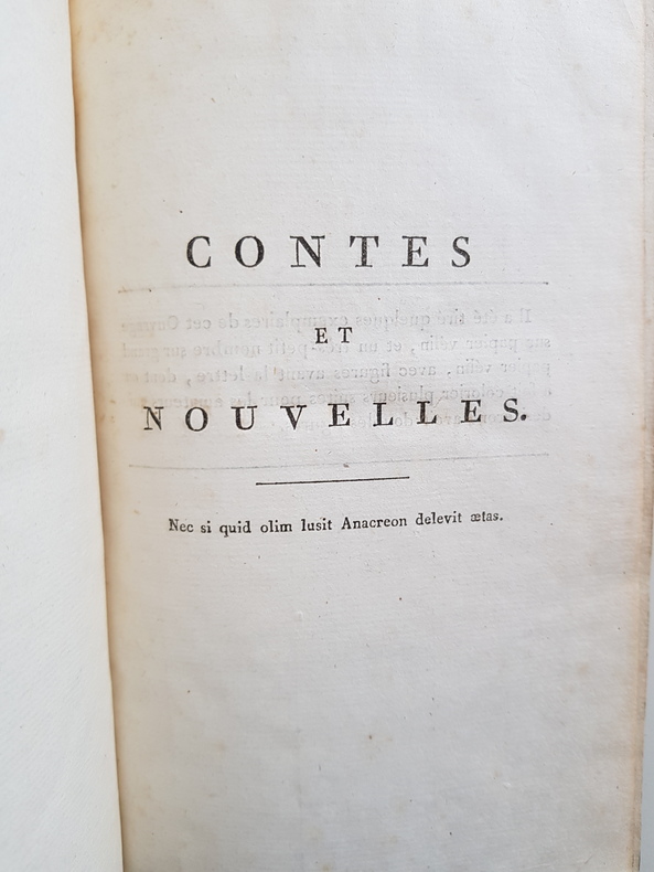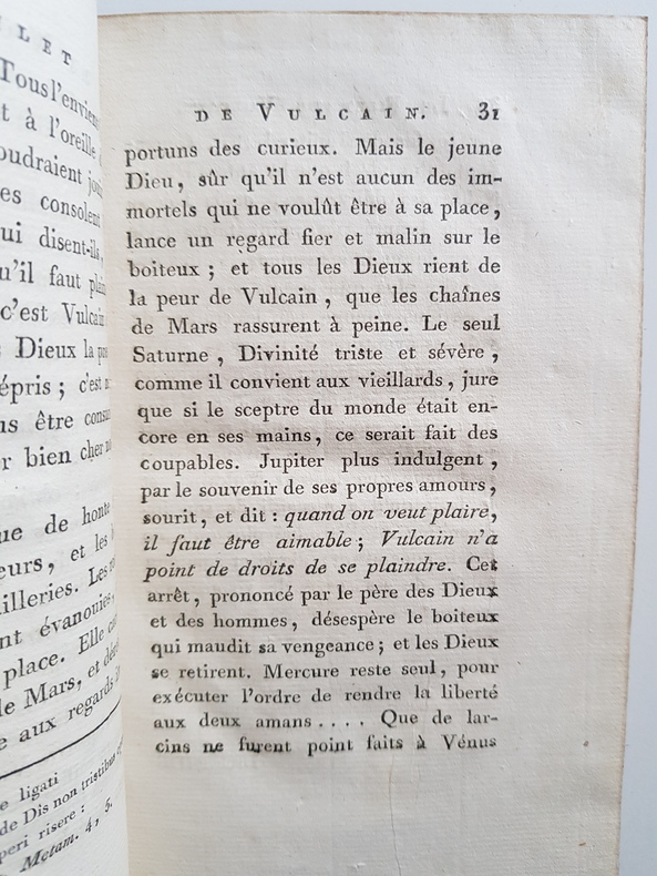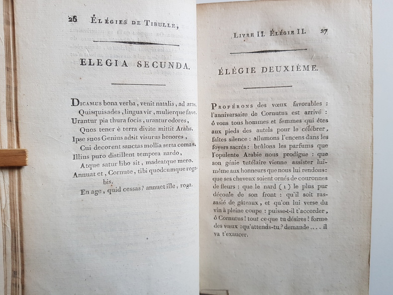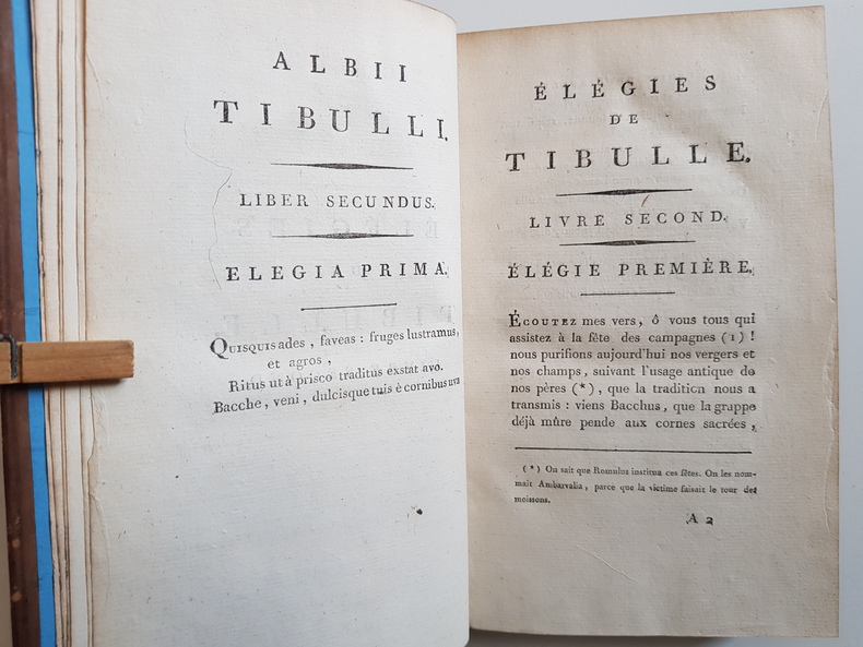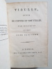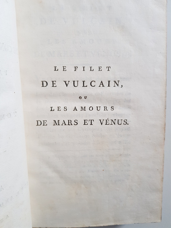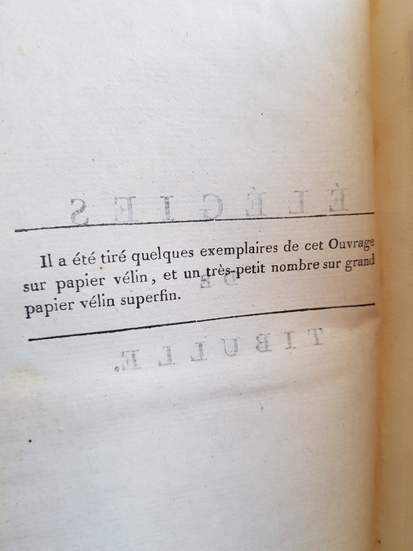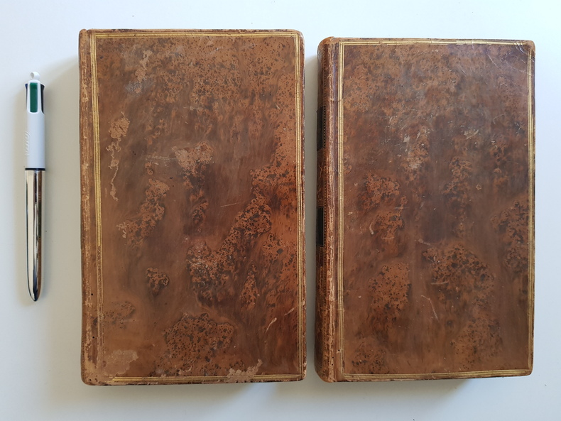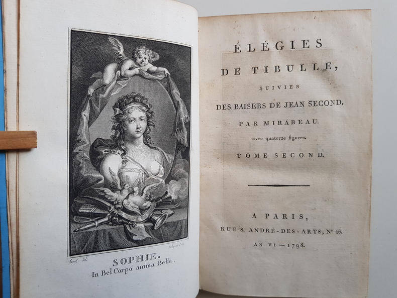 Titre : Élégies de Tibulle, suivies des Baisers de Jean Second… Tome second – Tibulle, suivi de Contes et Nouvelles… Tome troisième Auteur : Tibulle, Albius – Mirabeau, Honoré‑Gabriel Riqueti – Second, Jean (Janus Secundus) Lieu : Paris Éditeur : s.n., Rue S. André‑des‑Arts, n° 46 Date : An VI – 1798 Nombre de volumes : 2 volumes (tomes 2 et 3 seuls) Reliure : Pleine basane marbrée de l'époque, encadrement de filets dorés sur les plats, dos lisses richement ornés de fleurons et roulettes, pièces de titre et de tomaison vert sombre dorées Illustrations : Nombreuses figures gravées hors texte, dont frontispice ‘Sophie' signé Borel del. et Delignon sculp. ; titre du t. II annonçant « avec quatorze figures », t. III « avec figures » Langue : Texte latin et traduction française en regard Contenu : – Tome II : Élégies de Tibulle, suivies des Baisers de Jean Second (traduction par Mirabeau), avec planches gravées. – Tome III : Tibulle, suivi de Contes et Nouvelles (par Mirabeau), notamment ‘Le Filet de Vulcain, ou les Amours de Mars et Vénus', avec figures. Particularités d'exemplaire : Avis de tirage imprimé indiquant qu'il « a été tiré quelques exemplaires de cet Ouvrage sur papier vélin, et un très‑petit nombre sur grand papier vélin superfin » État : Bel ensemble d'époque, frottements d'usage aux plats et aux coiffes, petites épidermures et coins émoussés ; mors localement fendillés sans gravité ; papier vélin frais dans l'ensemble avec rousseurs et brunissures éparses, pâles mouillures marginales à quelques feuillets ; belles impressions des tailles‑douces
