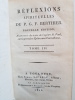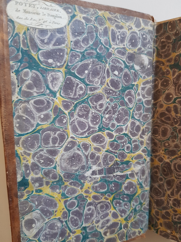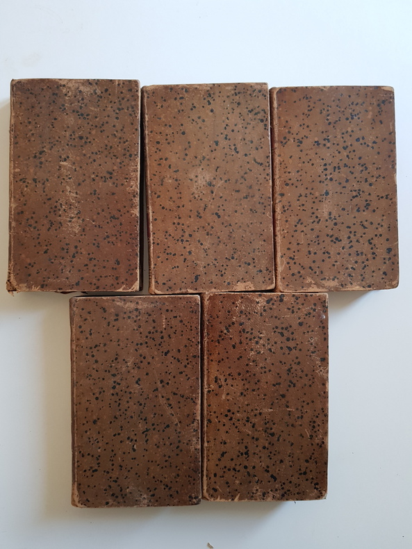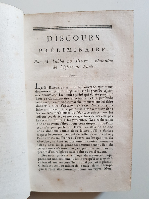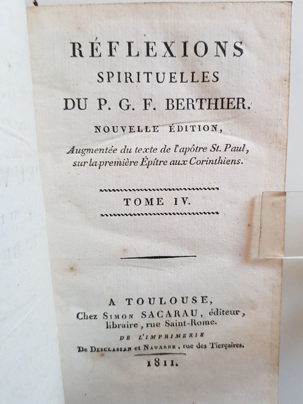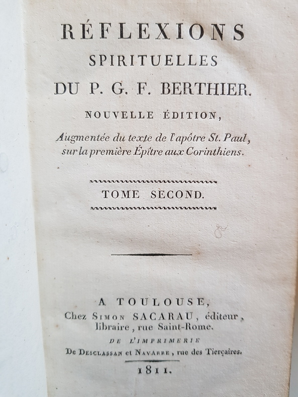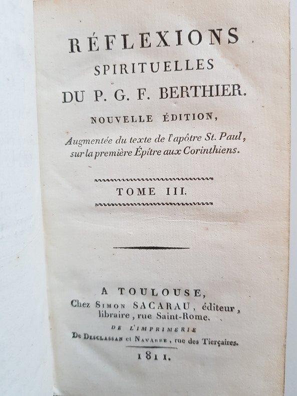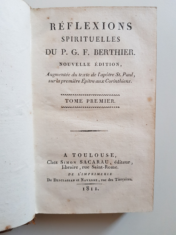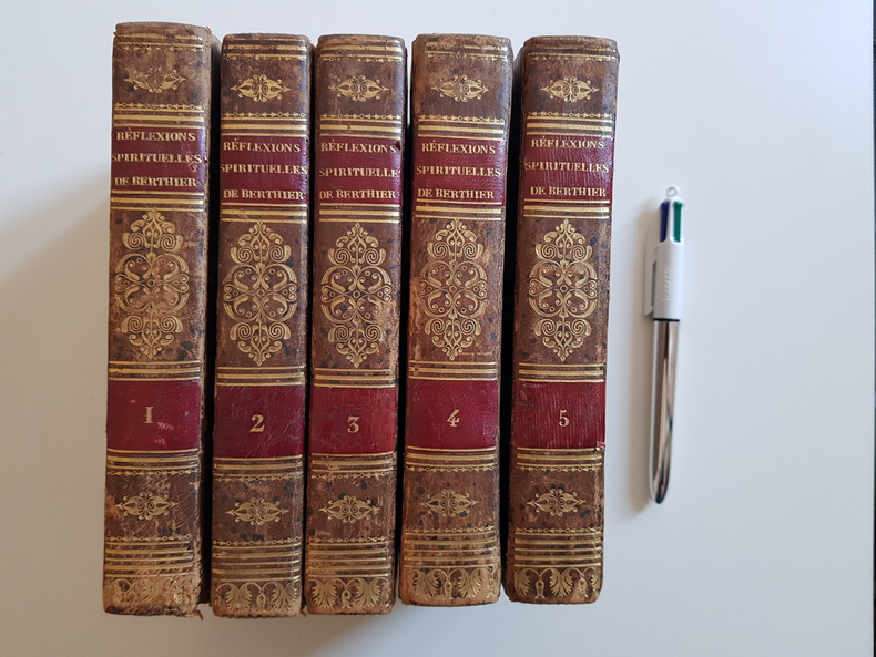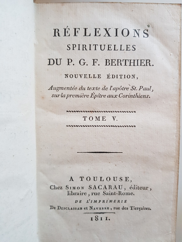 Titre : Réflexions spirituelles du P. G. F. Berthier. Nouvelle édition, augmentée du texte de l'apôtre St Paul, sur la première Épître aux Corinthiens Auteur : Berthier Guillaume‑François Lieu : Toulouse Éditeur : Chez Simon Sacarau, éditeur‑libraire – De l'imprimerie de Desclassan et Navarre Date : 1811 Édition : Nouvelle édition Volumes : 5 tomes, complet Format : In‑12 (env. 17 x 10,5 cm) Reliure : Plein veau moucheté de l'époque, dos lisses ornés de fleurons et filets dorés, pièces de titre et de tomaison rouges, tranches et gardes marbrées Description : Ensemble homogène des cinq tomes, dos numérotés 1‑5. Titre courant Réflexions spirituelles de Berthier. Tome I précédé d'un Discours préliminaire par l'abbé du Pinet, chanoine de l'église de Paris. Exemplaires propres, papier bien conservé avec rousseurs et brunissures éparses, quelques cahiers légèrement serrés ou lâches par endroits, frottements d'usage aux plats et aux coiffes, petits manques en tête ou queue de certains dos. Ancienne étiquette de libraire « Potey, libraire, rue du Bac » sur un contreplat. Bel ensemble cohérent et solide d'une édition toulousaine peu commune. Langue : Français