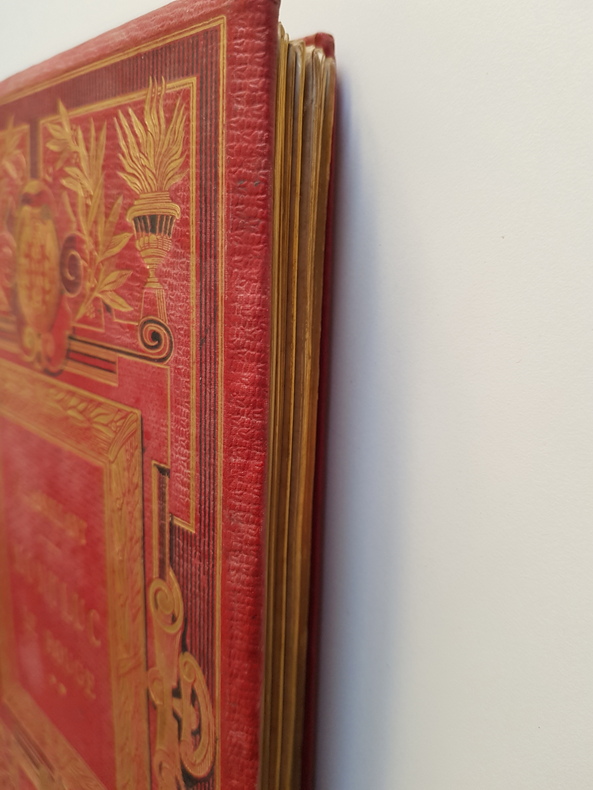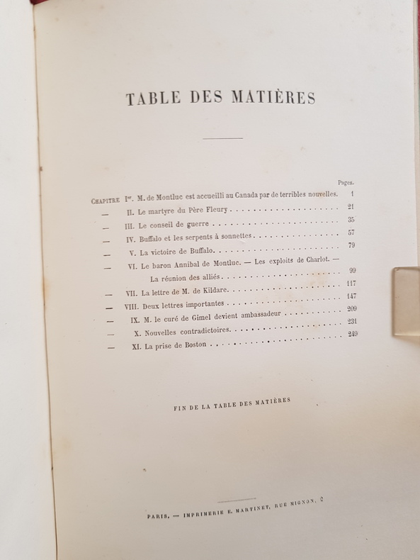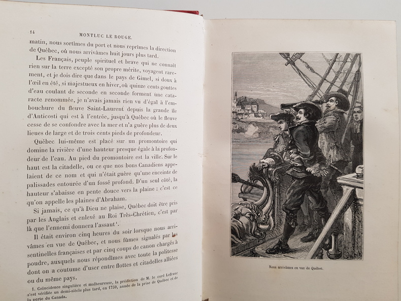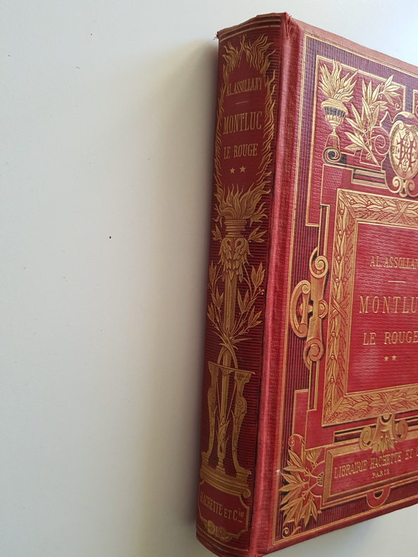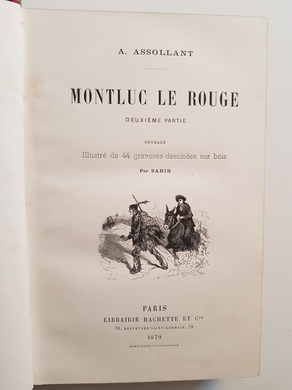 Titre : Montluc le Rouge - Deuxième partie Auteur : Assollant Alfred Illustrateur : Sahib Lieu d'édition : Paris Éditeur : Librairie Hachette et Cie Date d'édition : 1879 Édition : Édition illustrée de 44 gravures sur bois (deuxième partie seule) Reliure : Cartonnage éditeur pleine percaline rouge richement orné de motifs dorés et noirs, dos orné, tranches dorées Format : In-8 (env. 26 x 19 cm) Langue : Français Illustrations : 44 gravures sur bois d'après Sahib Description : Belle édition Hachette de la seconde partie du roman d'aventures historiques d'Alfred Assollant. Récit situé en Amérique du Nord à l'époque de la Nouvelle-France, avec des épisodes à Québec et jusqu'à la prise de Boston. Table des matières en fin (chapitres tels que 'Le martyre du Père Fleury', 'La victoire de Buffalo', 'La lettre de M. de Kildare', 'La prise de Boston'). Imprimé par E. Martinet, rue Mignon, Paris. État du livre : Cartonnage très décoratif bien conservé, quelques frottements, coins émoussés et petites usures aux coiffes ; plats propres avec dorure encore fraîche, léger voile et petites marques au second plat. Intérieur propre avec rares rousseurs éparses, cahiers bien solidaires.