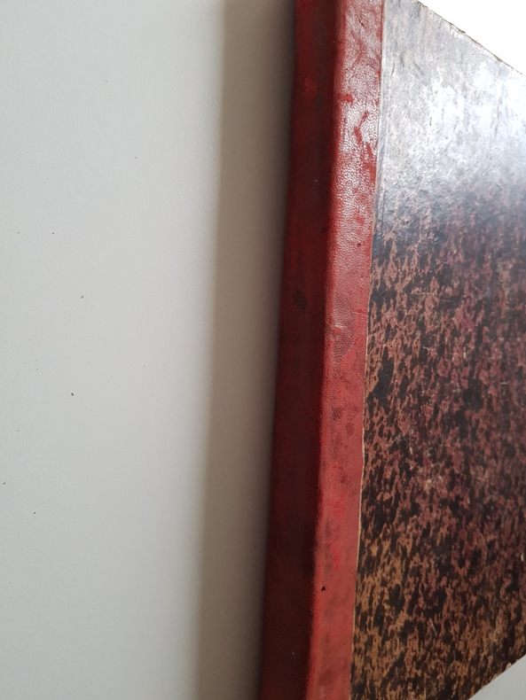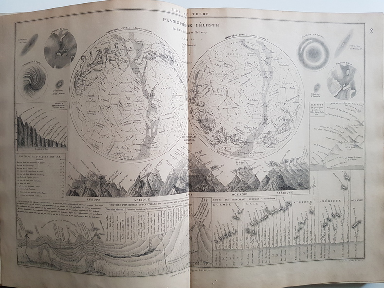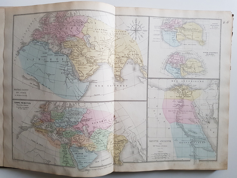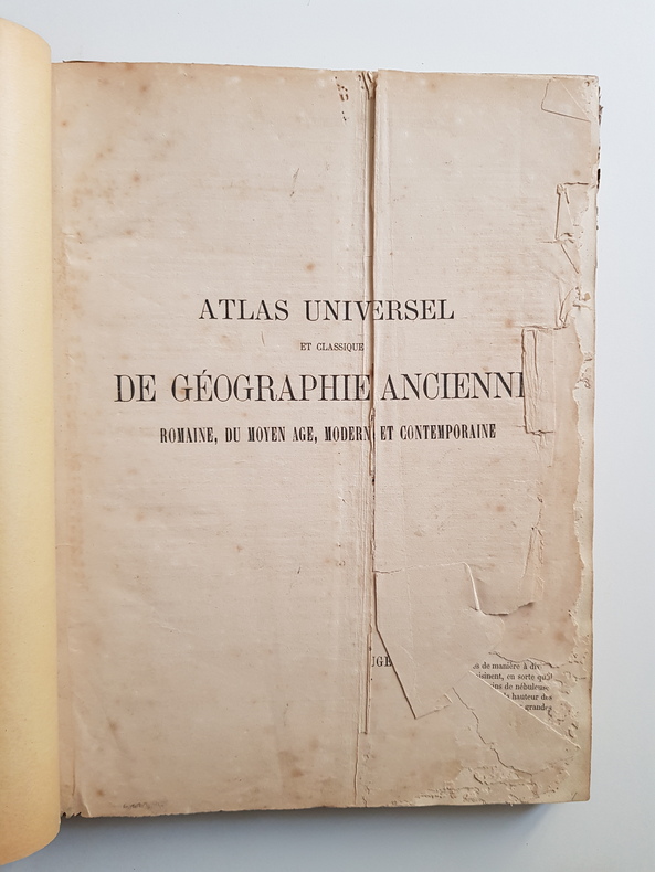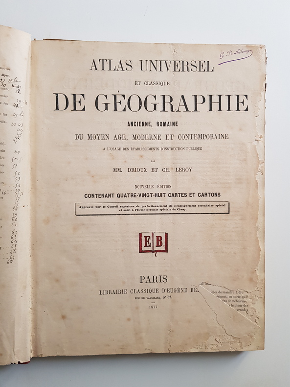 Titre : Atlas universel et classique de géographie ancienne, romaine, du Moyen Âge, moderne et contemporaine Auteur : Drioux, B. - Leroy, Ch. Éditeur : Librairie Classique d'Eugène Belin Lieu d'édition : Paris Date d'édition : 1877 Édition : Nouvelle édition Reliure : Demi-basane rouge de l'époque, plats marbrés in-folio Format : env. 37 x 28 cm Langue : français Illustrations : 88 cartes et cartons annoncés, planches de cosmographie, planisphère céleste, nombreuses cartes en noir et en couleurs pastel Description de l'exemplaire : Reliure d'époque avec frottements d'usage, coins émoussés, petites épidermures. Faux-titre et page de titre fortement froissés avec déchirures et manques en marge inférieure droite ; quelques restaurations anciennes possibles. Rousseurs éparses, plis et déchirures marginales ponctuelles dans le corps de l'ouvrage ; quelques annotations anciennes au crayon. Ancienne signature manuscrite 'G. Barthélémy' sur les premiers feuillets. Intérieur composé de grandes planches doubles comprenant cosmographie, planisphère céleste et cartes historiques (ex. Égypte ancienne), certaines en teintes.