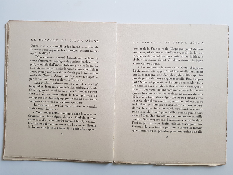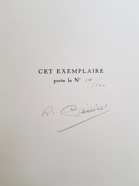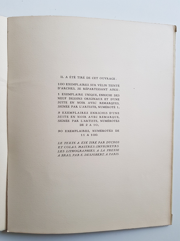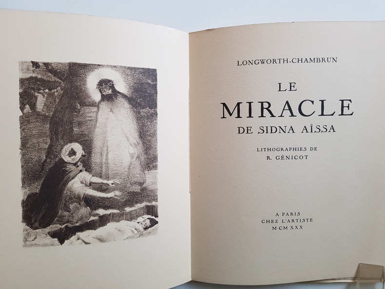 Titre : Le Miracle de Sidna Aïssa Auteur : Longworth-Chambrun Illustrateur : Génicot R. Lieu : Paris Éditeur : Chez l'artiste Date : 1930 Langue : Français Reliure : Broché, couverture imprimée d'origine, grands témoins, non rogné Tirage : Édition originale limitée à 100 exemplaires sur vélin teinté d'Arches. Exemplaire n° 14/100, signé au crayon par R. Génicot sur la page de justification. Texte tiré par Ducros et Colas, maîtres-imprimeurs ; lithographies tirées à la presse à bras par E. Desjobert, à Paris. Description : Livre d'artiste illustré de lithographies originales en noir de R. Génicot, dont un frontispice pleine page. Page de titre portant la mention À Paris, chez l'artiste, MCMXXX. Justification du tirage détaillant la répartition des exemplaires. Marges larges, papier de qualité, impression soignée. État du livre : Bon état général ; couverture très légèrement marquée, intérieur propre et frais.