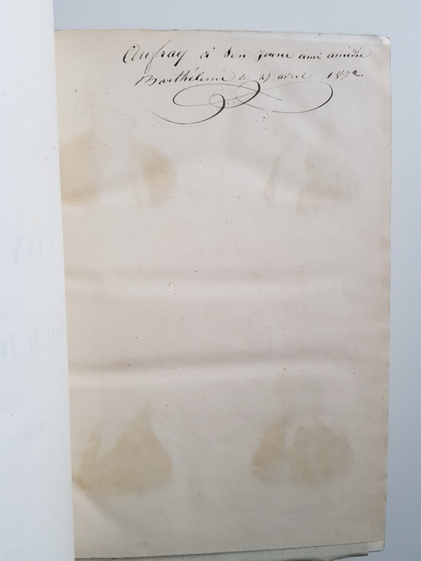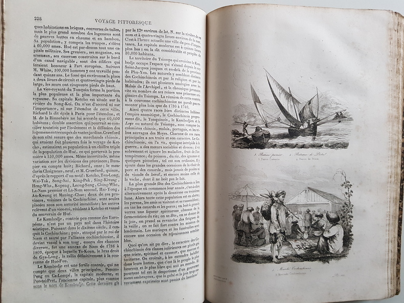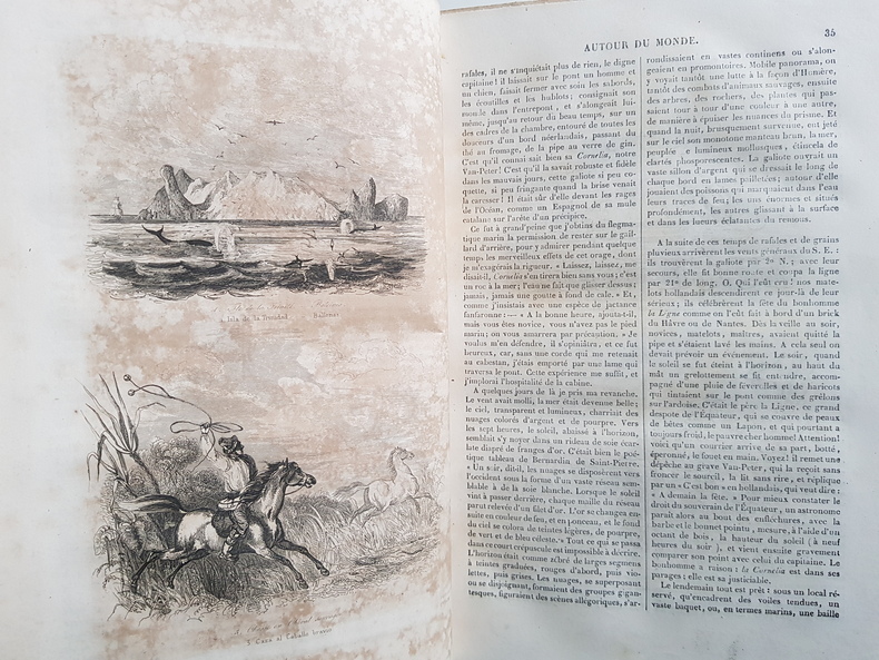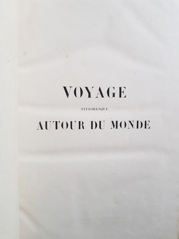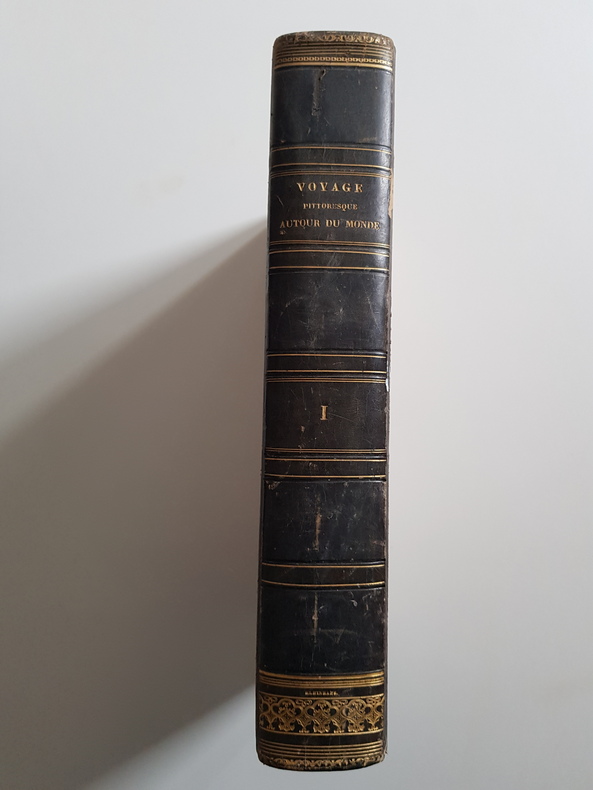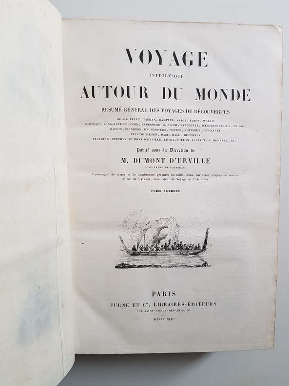 Auteur : Dumont d'Urville Jules Titre : Voyage pittoresque autour du monde. Résumé général des voyages de découvertes… Tome premier Illustrateur : Sainson Louis‑Auguste de Lieu d'édition : Paris Éditeur : Furne et Cie, libraires‑éditeurs Date d'édition : 1842 Format : grand in‑4 (environ 33 x 25 cm) Reliure : demi‑basane noire de l'époque, dos lisse orné de filets et fleurons dorés, plats marbrés État du livre : exemplaire solide présentant frottements d'usage aux plats et au dos, coins émoussés, rousseurs et brunissures éparses, quelques mouillures marginales, ancienne inscription manuscrite datée 1842 en page de garde. Tome I seul. Description : Importante synthèse illustrée des grandes explorations maritimes de Magellan à l'époque contemporaine, publiée sous la direction de Dumont d'Urville. Nombreuses gravures en taille‑douce d'après Sainson, dont plusieurs à pleine page, vignettes dans le texte, cartes annoncées par l'éditeur. Texte en français.