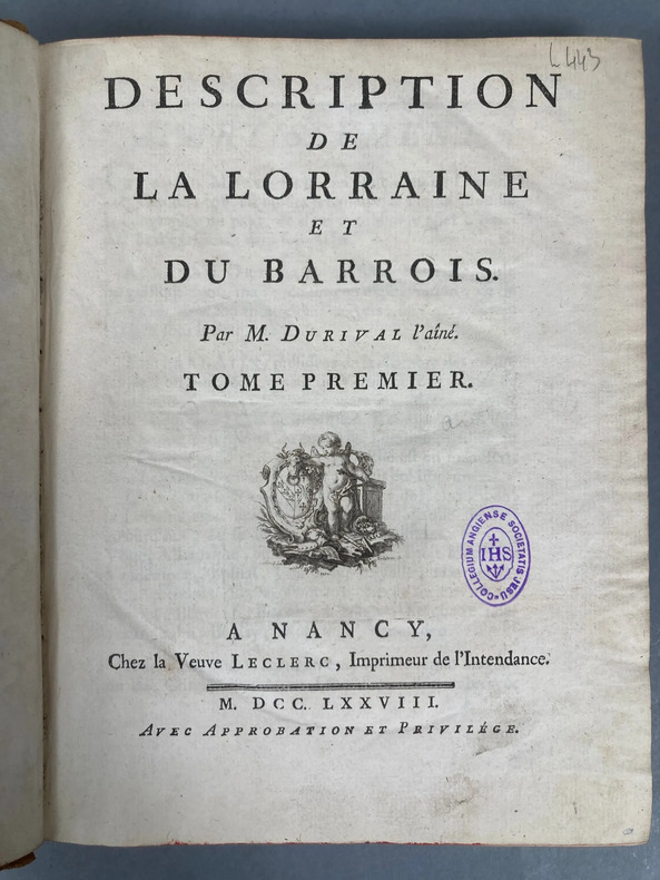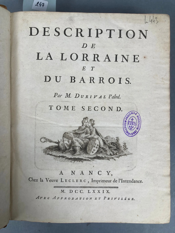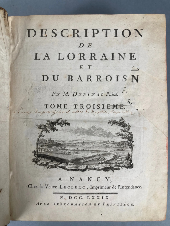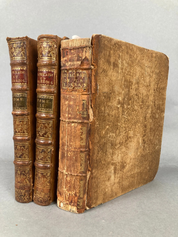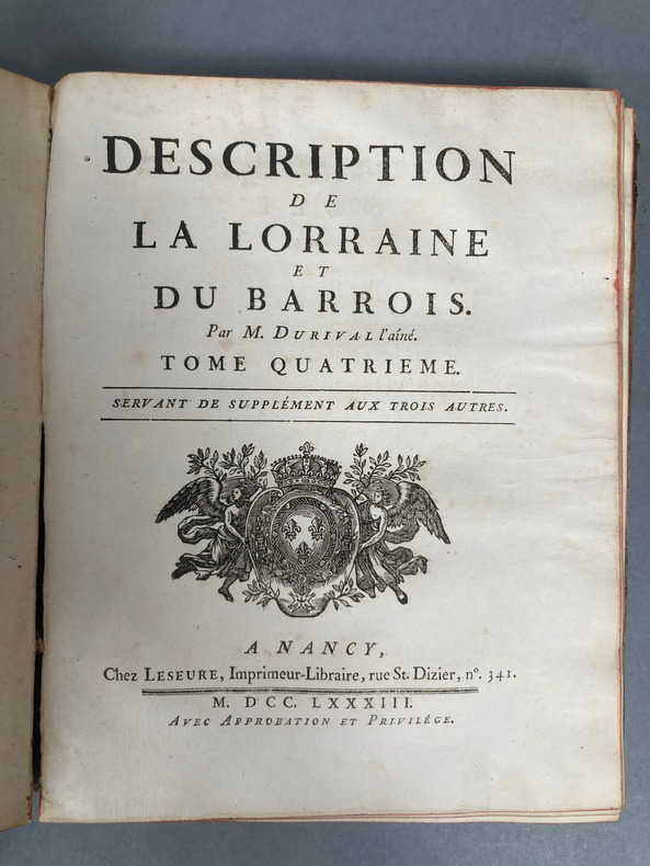 DURIVAL (Nicolas) - Description de la Lorraine et du Barrois. Nancy, Veuve Leclerc, 1778 ., in-4, XXII + 392 + XII + 396 + 460 + IV + 248 + [8] + 4 pp. de table, reliures plein veau marbré de l'époque, dos ornés à 5 nerfs, tranches peintes en rouge, pièce de titre en maroquin rouge et de tomaison en maroquin vert. Les 4 volumes. Les volumes 3 et 4 sont dans une reliure demi-veau d'époque en état moyen. Livre bien complet de sa carte dépliante (contours coloriés). Nous avons les trois tomes et le quatrième de supplément. Après une introduction historique de la Lorraine se trouve une description géographique, village par village, bailliage par bailliage. Jean-Baptiste Luton Durival, né le 4 juillet 1725 à Saint-Aubin-sur-Aire et mort le 14 février 1810 à Heillecourt, est un historien français. Frère cadet de Nicolas Luton Durival, Jean-Baptiste fut, après son frère, secrétaire des conseils d’Etat et des finances de Stanislas, duc de Lorraine. En 1766, il devint premier secrétaire des Affaires étrangères, sous le ministère du duc de Choiseul. En 1777, il fut envoyé en Hollande, en qualité de ministre de France. Il a fourni des articles à l’Encyclopédie sur l’Art militaire, et a laissé quelques opuscules inédits. Il a été membre de l’Académie de Stanislas. Très bel exemplaire. Vente Levrun 837, Noël 4067.
