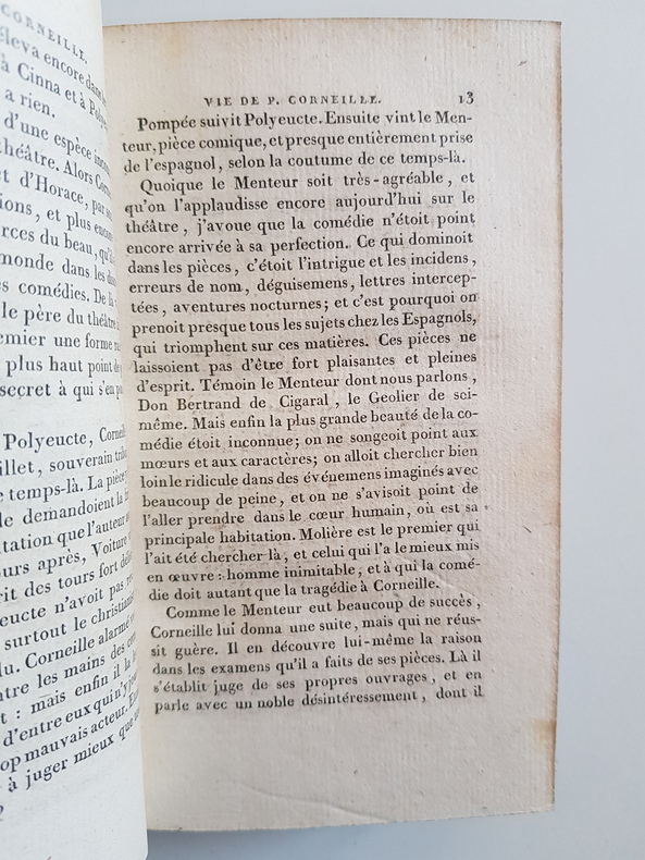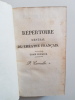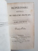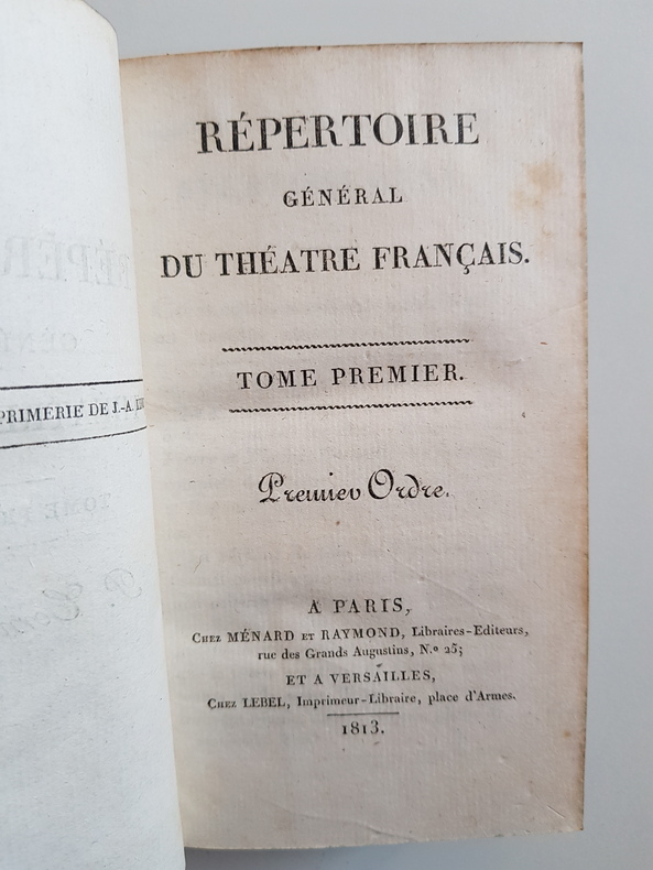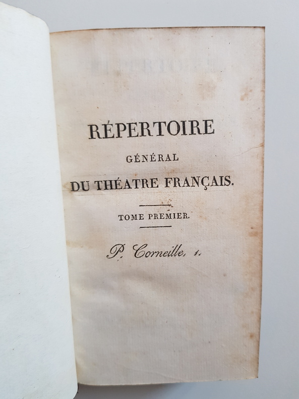 Titre : Répertoire général du théâtre français. Tomes 1 et 2 en un seul volume - Premier Ordre Auteur : Corneille Pierre Lieu : Paris et Versailles Éditeur : Ménard et Raymond - Lebel Date : 1813 Collection : Répertoire général du théâtre français Reliure : Plein veau marbré d’époque, dos lisse orné de fers dorés, pièces de titre vert foncé, filets et petits fers, tranches lisses. Dos titré Théâtre français - I-2 - Corneille Format : In-12 (env. 18 x 11 cm) Langue : Français État : Bon état d’usage. Frottements et marques d’épidermure sur les plats, coins émoussés, coiffes usées, petites fentes superficielles aux mors sans gravité, intérieur avec rousseurs et brunissures éparses, papier sain et solide Description : Première édition de 1813 de cette livraison du Répertoire général du théâtre français consacrée à P. Corneille. Le volume s’ouvre par une Vie de P. Corneille, suivie des textes dramatiques. Bel exemplaire en reliure d’époque, au dos richement orné. Le titrage du dos mentionne I-2 - Corneille, conforme à la numérotation de la série Théâtre français