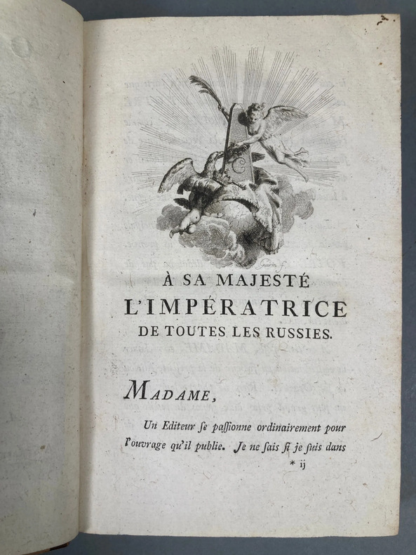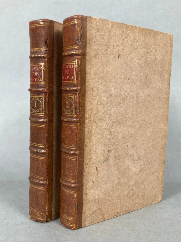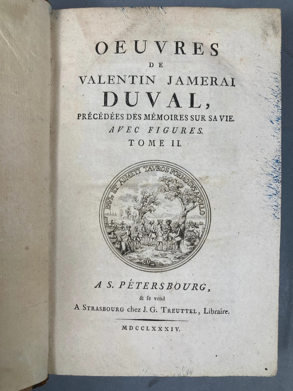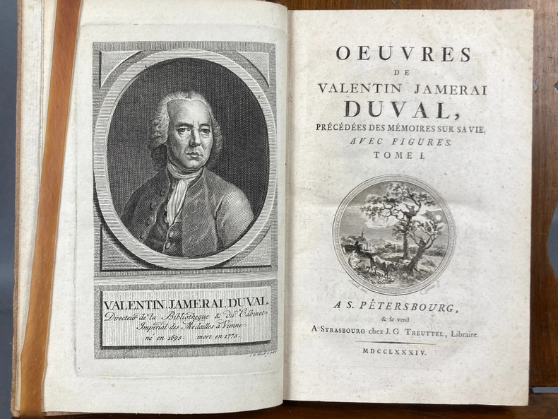 JAMERAI DUVAL (Valentin) - Oeuvres de Valentin Jamerai Duval, précédées des mémoires sur sa vie. Saint Pétersbourg, & se vend à Strasbourg chez J.G. Treuttel, 1784 ., in-4, frontispice, XIV-322 + 334 pp., reliures d'époque demi-veau, dos à 5 nerfs, tranches jaspées, pièces de titre en maroquin rouge. Les 2 volumes. Ouvrage illustré de 9 figures dans le texte en comptant le frontispice. Très rare ouvrage. Valentin Jamerai-Duval né en 1695 à Arthonnay et décédé à Vienne en 1775, est un grand savant de son époque. Il fait ses études à Pont-à-Mousson et il est repéré par François III de Lorraine qui le place à des postes importants de son administration. Ex-libris François de Chanteau.