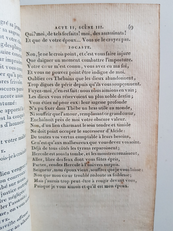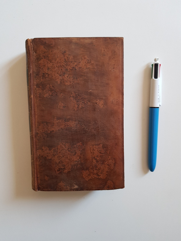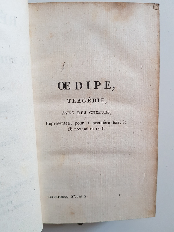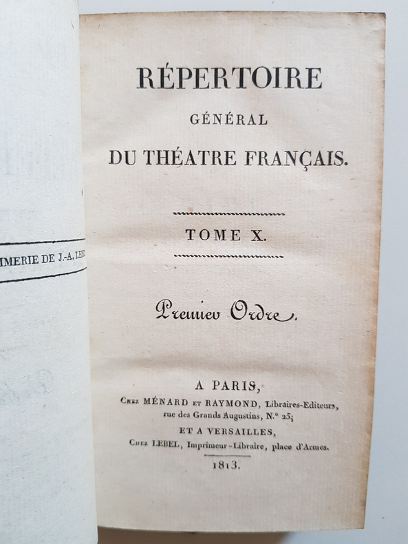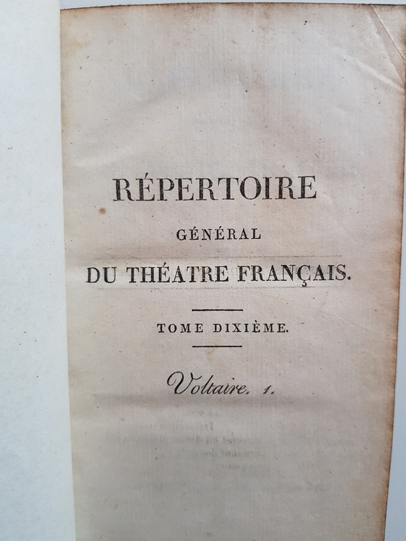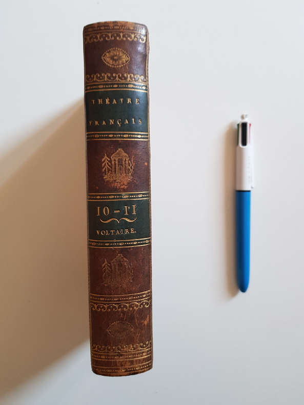 Titre : Répertoire général du Théâtre français - Tome 10 et 11 en un seul volume. Voltaire, 1 et 2. Premier Ordre Auteur : Voltaire, François-Marie Collection/Série : Répertoire général du Théâtre français Tome : X et XI (Voltaire 1 et 2) Lieu : Paris et Versailles Éditeur : Ménard et Raymond, libraires-éditeurs ; Lebel, imprimeur-libraire Date : 1813 Langue : Français Format : In-12 (env. 17,5 x 10,5 cm) Reliure : Plein veau marbré de l'époque, dos lisse orné avec pièces de titre vert sombre et filets dorés, mention au dos « Théâtre français 10-11 Voltaire » Description : Exemplaire de la célèbre collection dramatique du début du XIXe siècle. Ce volume correspond au Tome X, premier ordre consacré à Voltaire. On y trouve notamment Œdipe, tragédie avec chœurs, créée le 18 novembre 1718. Intérieur frais dans l'ensemble, quelques rousseurs et petites taches éparses, pli angulaire ancien sur quelques feuillets ; reliure d'époque frottée avec coins émoussés et petites usures aux mors et coiffes. Bel témoin des éditions postrévolutionnaires du théâtre classique.