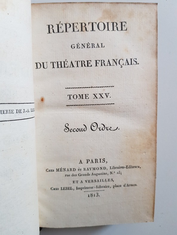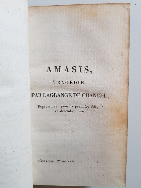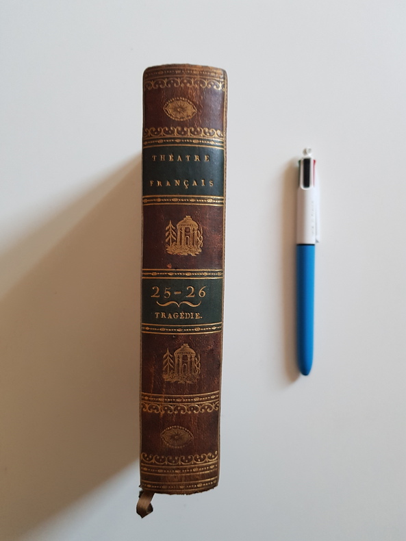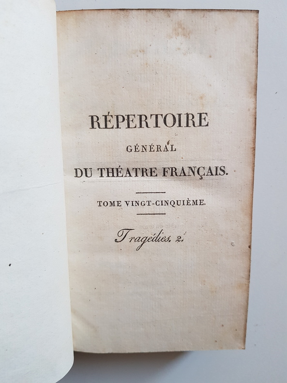 Titre : Répertoire général du Théâtre Français. Tomes 25 et 26 en un seul volume - Second Ordre. Tragédies 2 et 3 Auteur : Collectif Lieu : Paris et Versailles Éditeur : Ménard et Raymond, libraires‑éditeurs ; Lebel, imprimeur‑libraire Date : 1813 Collection / Série : Répertoire général du Théâtre Français Langue : français Format : in‑12 approx. Reliure : plein veau marbré d'époque, dos lisse orné de filets et fers dorés, pièces de titre et de tomaison vert foncé, mention au dos « Théâtre Français – 25‑26 – Tragédie », ruban signet État : bon exemplaire d'usage ; frottements au cuir, coiffes et coins émoussés, rousseurs et brunissures éparses ; intérieur solide Contenu : Volume de la série des tragédies du Répertoire ; comporte notamment « Amasis, tragédie » par Lagrange‑Chancel (créée le 13 décembre 1701).