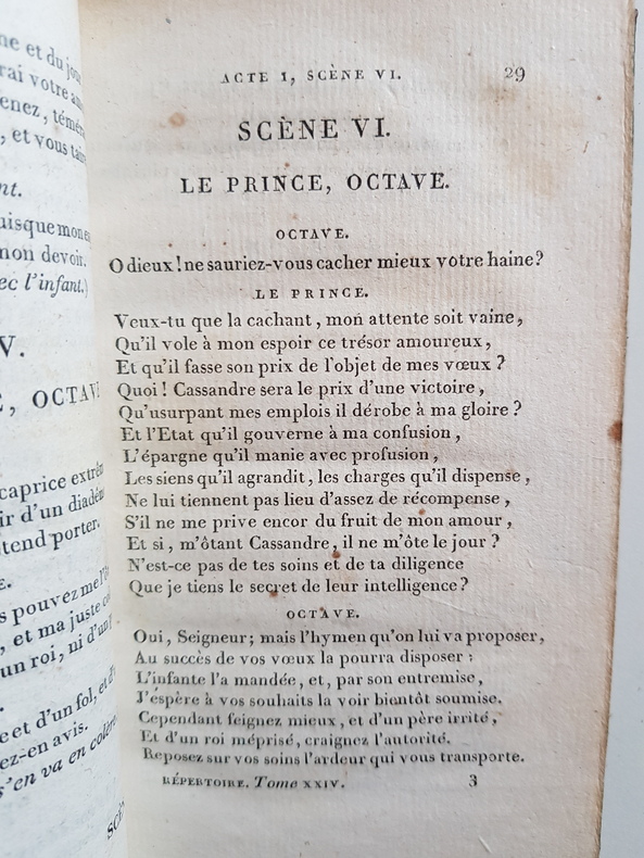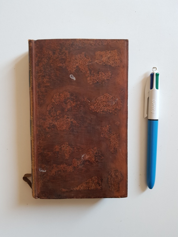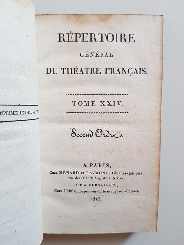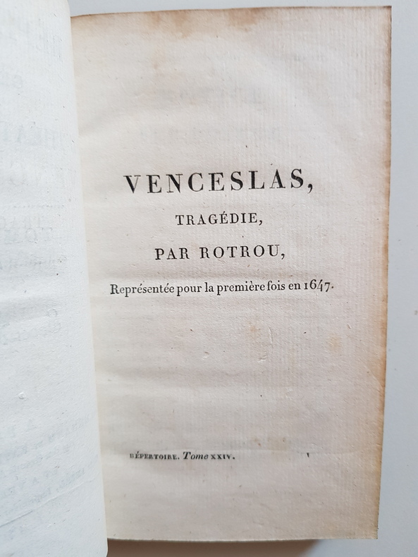 Titre : Répertoire général du Théâtre français. Tome XXIV - Second ordre. Tragédies Auteur : Rotrou, Jean (et autres) Lieu : Paris et Versailles Éditeur : Chez Ménard et Raymond, libraires-éditeurs, rue des Grands-Augustins n°25 ; et chez Lebel, imprimeur-libraire, place d'Armes Date : 1813 Reliure : Plein veau marbré d'époque, dos lisse orné de fers dorés, pièces de titre et de tomaison vert sombre, filets dorés, tranches mouchetées, signet Description : Volume de la célèbre collection du Répertoire général du Théâtre français, consacré aux tragédies (second ordre). Contient notamment Venceslas, tragédie de Rotrou (représentée pour la première fois en 1647). Petit volume maniable, impression nette sur vergé. Exemplaire solide, avec frottements d'usage au cuir, petites usures aux coiffes, légère tache au plat, rousseurs éparses et brunissures ponctuelles, bon état général intérieur.