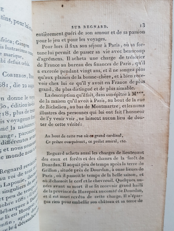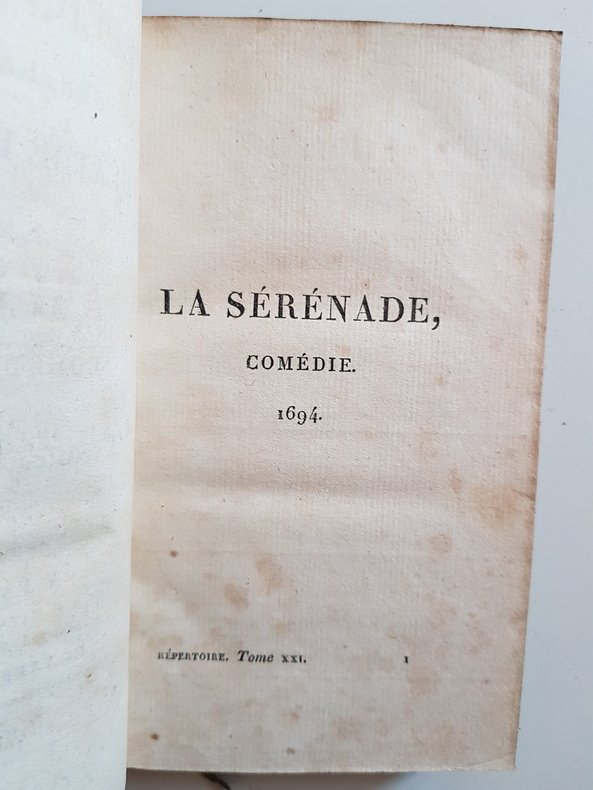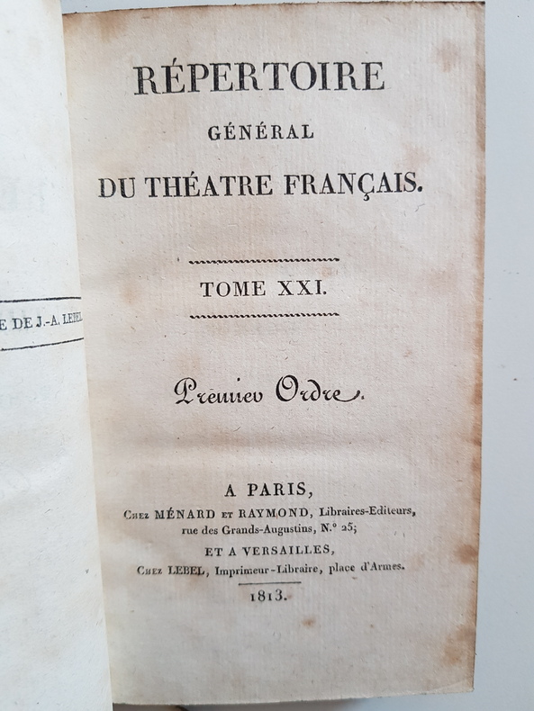 Titre : Répertoire général du théâtre français - Tome XXI - Premier Ordre (Regnard 1) Auteur : Regnard Jean-François Lieu : Paris et Versailles Éditeur : Ménard et Raymond, libraires‑éditeurs ; Lebel, imprimeur‑libraire Date : 1813 Collection : Répertoire général du théâtre français Tome : XXI (vingt‑unième) Contenu : Notice sur Regnard ; La Sérénade, comédie, 1694 Langue : français Format : in‑12 Reliure : plein veau d'époque, dos lisse orné de filets et fers dorés, pièces de titre et de tomaison vertes, encadrements et petits motifs dorés au dos État : frottements d'usage à la reliure, coins et coiffes émoussés, rousseurs éparses et papier bruni par le temps ; ensemble solide et propre Remarques : exemplaire de la série Théâtre français, volume consacré à Regnard
