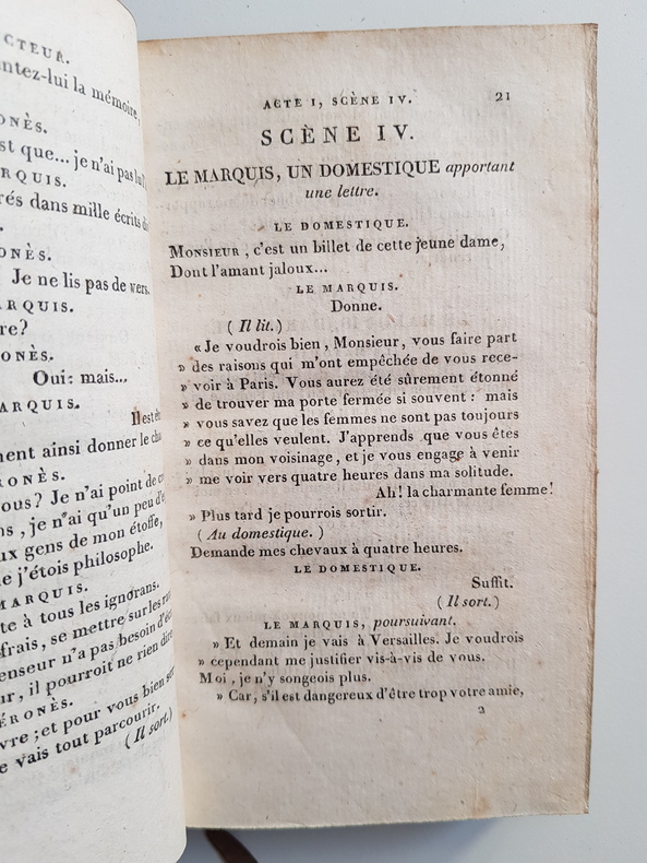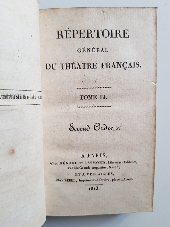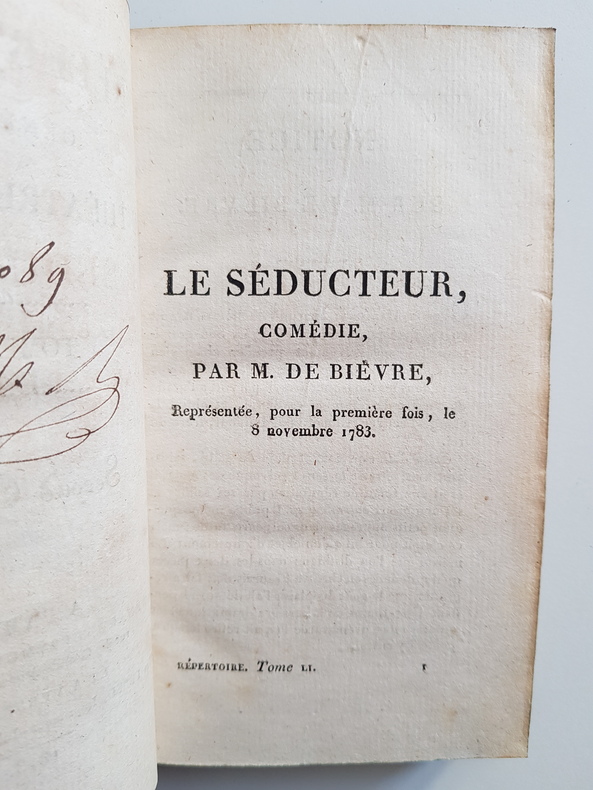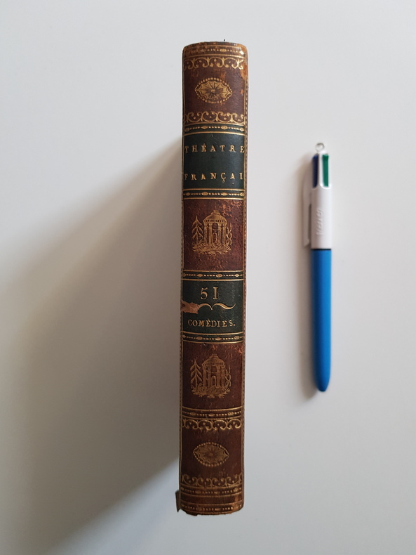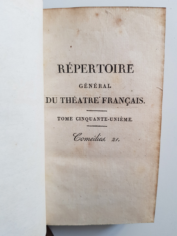 Titre : Répertoire général du Théâtre français - Tome 51 - Comédies 21 - Second Ordre Auteur : Bièvre François-Georges de (et autres) Lieu : Paris et Versailles Éditeur : Ménard et Raymond; Lebel Date : 1813 Langue : français Reliure : plein veau raciné d'époque, dos lisse orné de filets et fers dorés, pièces de titre et de tomaison vert foncé, caissons décorés, signet de soie Format : in-12, env. 17 x 10,5 cm État : bon état d'usage - plats et coins frottés, coiffes émoussées, mors solides, rousseurs et brunissures éparses, petite mouillure marginale au début, ancienne inscription manuscrite à l'encre en garde - volume seul Contenu : volume de la série des Comédies (Second Ordre). Contient notamment 'Le Séducteur, comédie, par M. de Bièvre', créée le 8 novembre 1783 Particularités : exemplaire d'époque joliment relié, dos décoratif 'Théâtre Français - 51 - Comédies', mention 'Second Ordre' sur la page de titre