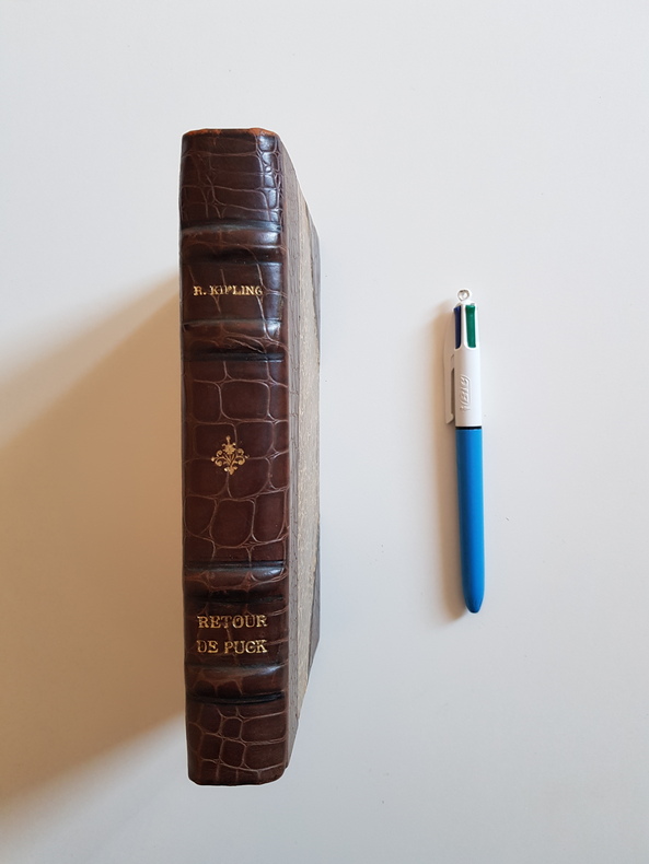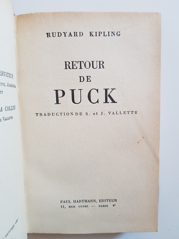 Titre : Retour de Puck Auteur : Kipling Rudyard Traducteurs : S. Vallette et J. Vallette Éditeur : Paul Hartmann, éditeur Lieu : Paris Date : 1935 Édition : Édition originale française Tirage : 250 exemplaires sur Alfax Navarre numérotés 1-250 (ce tirage constitue l'édition originale) + 60 exemplaires sur vélin réservés à la Société de Bibliophiles Les Amis des Beaux Livres, marqués A.B.L. 1 à A.B.L. 60 Reliure : Demi-reliure cuir à coins, dos orné, titres dorés, plats de papier marbré Imprimeur : Achevé d'imprimer en mars 1935 par les Établissements Busson, 117, rue des Poissonniers, Paris Langue : Français Description : Recueil de contes et poèmes autour de Puck, le lutin facétieux de Kipling, mêlant souvenirs historiques et légendes d'Angleterre. Traduction française de S. et J. Vallette. Mention de tirage au colophon. Bel exemplaire relié. État : Bon état, papier uniformément jauni, quelques rousseurs éparses, reliure solide.