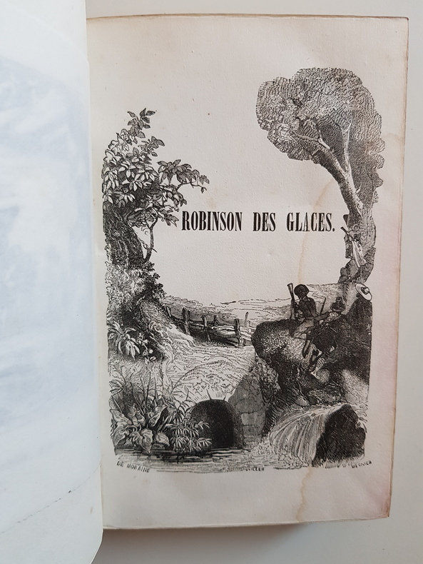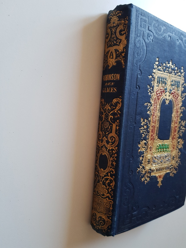 Nouvelle édition illustrée de 4 lithographies en sépia. Texte dans un encadrement. Cartonnage polychrome de l'éditeur en percaline noire. Grande plaque spéciale dorée sur le plat supérieur. Riche encadrement bleu, jaune, rose, blanc. Dos lisse très richement orné de polychromies. Plaque spéciale sur le plat inférieur : Robinson dans un médaillon orné de polychromie. Une mince fente en queue. Un coin émoussé. Quelques cahiers légèrement déboîtés. Bel exemplaire. Récit d'aventure pour la jeunesse. Une robinsonade dans une île de glace. - Photographies et détails sur www.Edition-Originale.com -