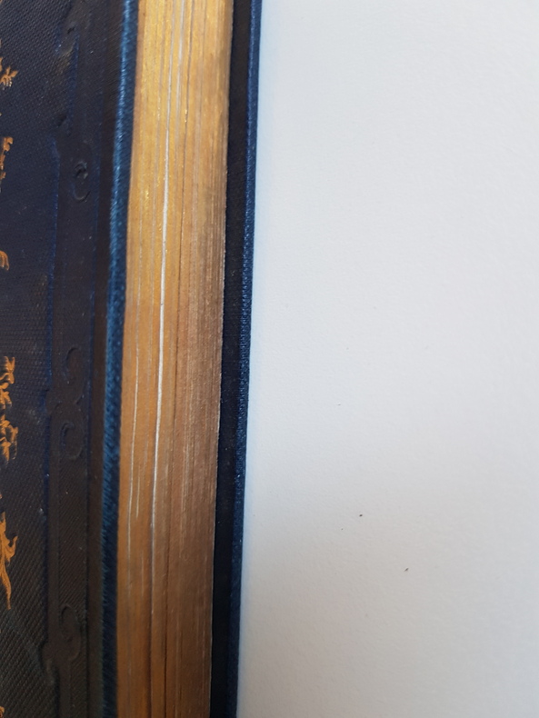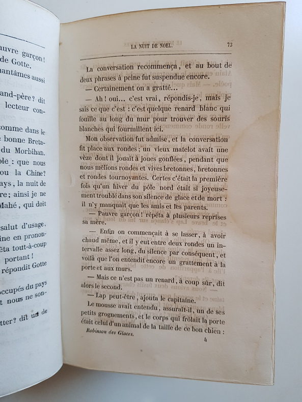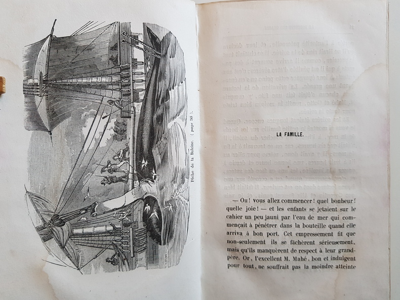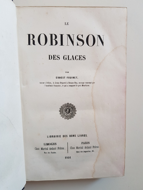 L’AUTEUR : Ernest FOUINET (Nantes, 1799- Paris, 1845), romancier, poète et traducteur de poèmes « orientaux », dont les talents furent reconnus par Hugo et Sainte-Beuve. Il se délassait en écrivant des ouvrages destinés à la jeunesse. L’ILLUSTRATION : Vingt-cinq lettres ornées, à connotation religieuse, en tête de chacun des vingt-cinq chapitres et, hors texte, quatre lithographies à deux teintes, non signées, sous serpente muette. L’ÉDITION : Cet ouvrage figure en bonne place au panthéon littéraire des « Robinsonnades », où il côtoie, entre autres, Johann David Wyss et son Robinson helvète (1812), Jules Verne et les mystères de l’Île (1874), jusqu’à Michel Tournier et ses veilles de Sabbat (1967 et 1971) ; le genre n’est pas encore épuisé. Le livre de Fouinet connut de multiples éditions depuis l’originale (Paris, Eymery, 1835), dédicacée « À la Reine des Français », hommage encore imprimé [en ligne sur google.books] dans l’édition de 1851 (Paris et Limoges, mêmes éditeurs,) ! La Seconde République fut éphémère, mais quand même. Dans notre exemplaire, le chapitre IV « Un mauvais livre » (pp.24-33) , décrit comme suit : un ouvrage « … imprimé il y a quarante ans peut-être [circa 1795] où il était dit que tous les hommes étaient égaux, que l’obéissance passive était flétrissante , et qu’il était du devoir de résister à une volonté injuste », lecture qui conduit le héros du roman a susciter une mutinerie qui échouera lamentablement et le mènera vers l’exil expiatoire. Ce qui est en parfaite adéquation avec l’appartenance de cette œuvre à la « Bibliothèque religieuse, morale, littéraire, pour l’enfance et la jeunesse, publiée avec approbation, etc ». Mais, au cours du temps, quelques retouches posthumes seront apportées : dans l’édition de 1891 (gallica), le chapitre IV a été refondu, le titre a disparu, toute référence au « mauvais livre » de même… Autres temps autres mœurs . En définitive, assez bel exemplaire de ce joli cartonnage qui se rencontre rarement en bon état. GAR (V3 G)