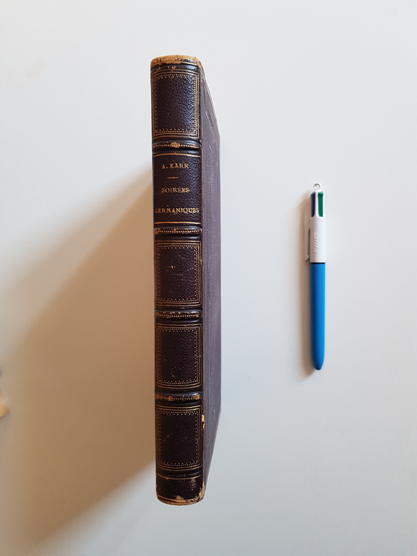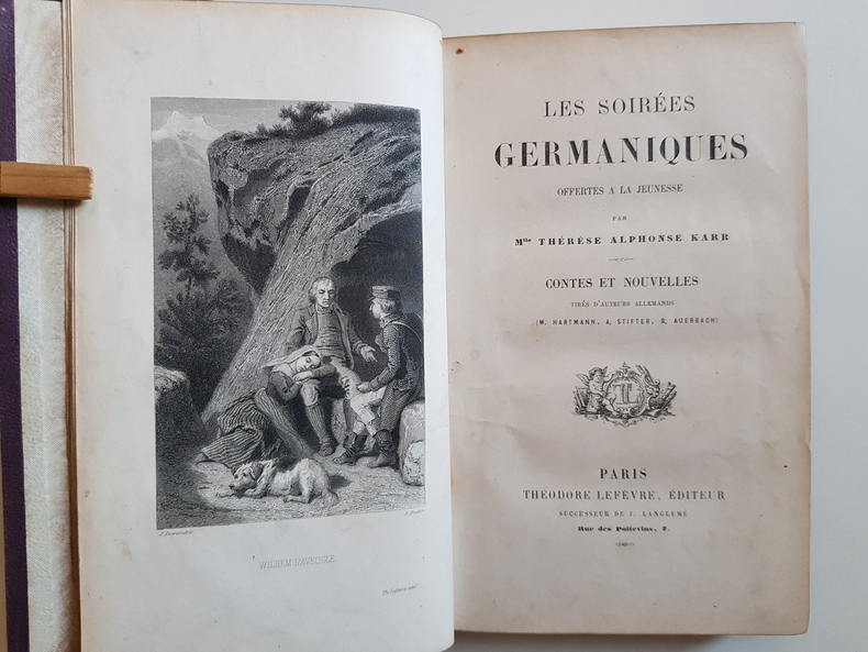 Titre : Les Soirées germaniques - offertes à la jeunesse Auteur : Karr Thérèse Alphonse Contributeurs : Hartmann Moritz - textes, Stifter Adalbert - textes, Auerbach Berthold - textes Lieu d'édition : Paris Éditeur : Théodore Lefèvre, successeur de J. Langlumé Date : s.d. (vers 1850-1860) Description : Recueil de contes et nouvelles pour la jeunesse tirés d'auteurs allemands par Mlle Thérèse Alphonse Karr. Contient notamment Wilhelm l'Aveugle, Les dons des Korigans, Le Banni, Le Salvador, Ditha, Un Contraste, Les Barbes rouges, Le dernier jour dans la patrie, La Reine des serpents. Texte en français. Illustrations : frontispice gravé et plusieurs planches hors texte sur acier, ornements typographiques Reliure : chagrin violet de l'époque, dos à nerfs orné de caissons et titres dorés, plats encadrés à froid, tranches dorées Format : in-8 État : bon exemplaire - frottements aux coiffes et aux coins, mors localement épidermés, rousseurs éparses surtout sur les planches, intérieur propre, reliure solide Langue : français