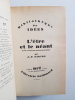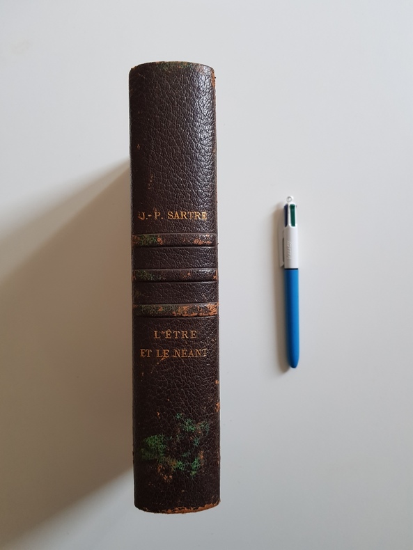Titre : L'être et le néant – Essai d'ontologie phénoménologique Auteur : Jean‑Paul Sartre Éditeur : Librairie Gallimard (nrf) Collection : Bibliothèque des Idées Lieu d'édition : Paris Date d'édition : 1943 Édition : 8e édition (mention portée sur la page de titre) Langue : Français Reliure : Demi-reliure cuir brun, dos à faux nerfs, titre et auteur dorés, plats marbrés Description : Exemplaire de l'édition 1943 dans la collection Bibliothèque des Idées, avec la mention 8e édition. Page de titre portant l'adresse 5, rue Sébastien-Bottin. Papier uniformément jauni par le temps. Exemplaire relié anciennement en demi-cuir brun, dos orné, plats papier marbré. Tranches lisses. État du livre : Reliure solide mais frottée, épidermures et usures d'usage au dos et aux coupes, petites traces verdâtres et manques superficiels au cuir, coins et coiffes émoussés. Intérieur propre dans l'ensemble, rousseurs et brunissures éparses, petites taches en pages liminaires, marge extérieure légèrement brunie.