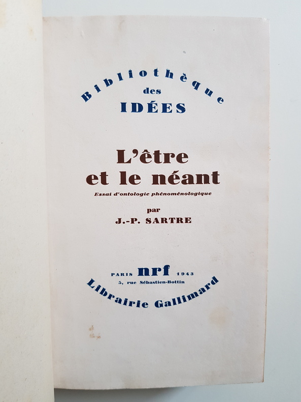 The very rare first edition, first impression from ""Bibliothèque des idées"" printed on 25th of June 1943 (""Le vingt-cinq juin mil neuf cent quarante-trois"" (colophon) ), rare review-copy (with ""S.P. - Service des Presses) to back wrapper. With the printed dedication ""au CASTOR"" (i.e. for Simone de Beauvoir""). This, the first edition of Sartre's first and main philosophical work, which is one of the absolutely most important philosophical works of the 20th century, passed virtually unnoticed, as it appeared in the summer of 1943, which is why it is now extremely scarce. It didn't reach recognition till 1945, thus very few copies of the first edition have been preserved. ""Achevé au debut de 1943, le livre parut en été et, étant donné les circonstances, passa à peu près inapercu. Il fallut attendre 1945, année aù la vogue soudaine de Sartre attira sur son oeuvre maîtresse une attention qu'aucun ouvrage philosophique n'avait connue précédemment, pour que les commenteurs s'en ampareut"" (Contat & Rybalka p. 86). Even though the work was hardly noticed when it first appeared, a few scholars acknowledged it as a great work of seminal character, importance and novelty; in 1964 Michel Tourier writes: Un jour de l'automme 1943, un livre tomba sur nos tables: ""L'Être et le Néant"". Il y eut eu moment de stupeur, puis une longue rumination. L'oeuvre était massive, hirsute, débortante, encyclopédique, superbement technique..."" (Les Nouvelles littéraires, 29 octobre 1964).Sartre is first and foremost known for his philosophical works, and as ""L'être et le néant"" (""Being and Nothingness"") is generally accepted as his greatest and main work, this marks the beginning of 20th century existentialism, and furthermore ""has also come to be regarded as a text-book of existentialism itself..."" (Mary Warnock's Introduction to Hazel E. Barnes' translation). This, his seminal work of existentialism, marks one of the most influential philosophical movements of our age.Contat & Rybalka, Les Écrits de Sartre, 1970.