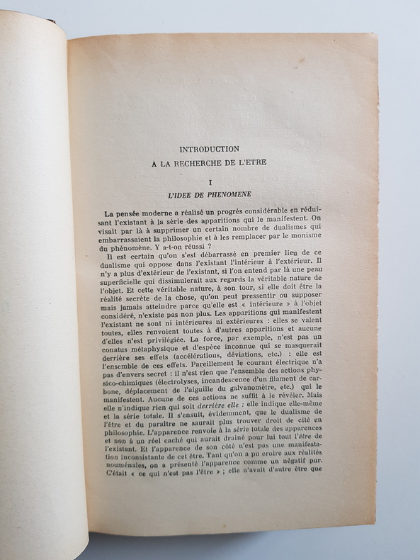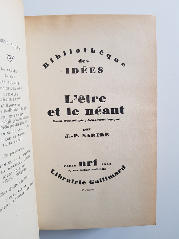 Gallimard "Bibliothèque des Idées" 1965, fort in-8 broché, 724 p. (plats de couverture légèrement défraîchis, dos un peu arrondi, sinon bon état ; épuisé dans la collection) Retirage à l'identique de l'originale de 1943 de son plus fameux essai philosophique.