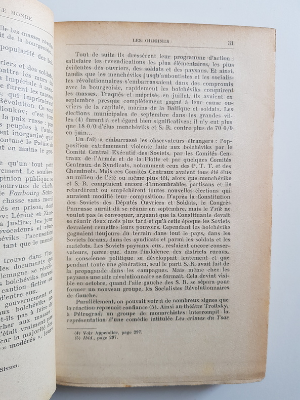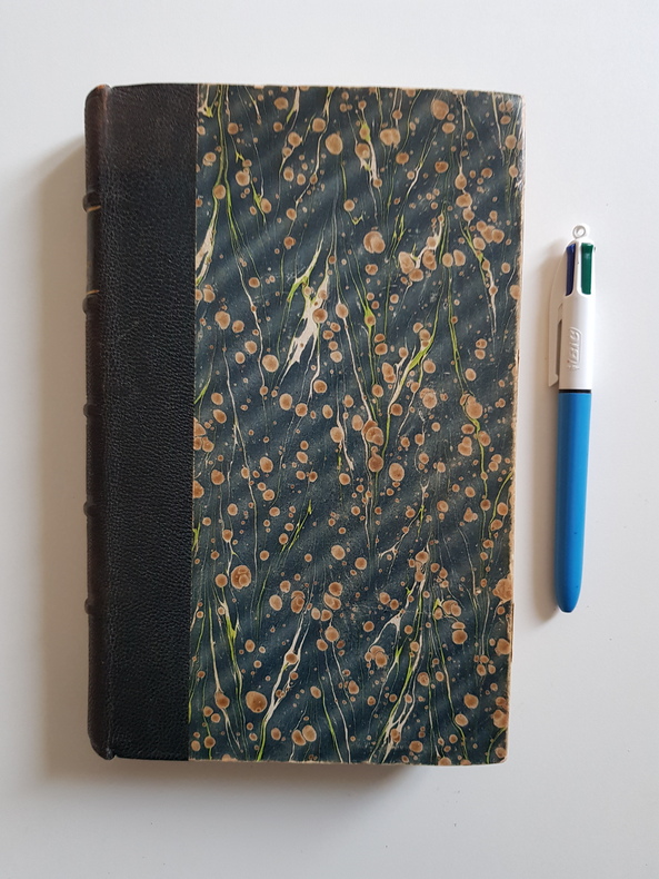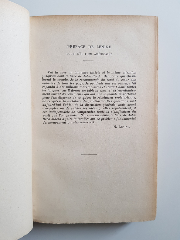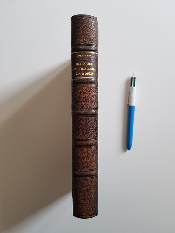 Titre : Dix jours qui ébranlèrent le monde Auteur : Reed John Lieu d'édition : Paris Éditeur : s.n. — imprimé par La Typo-Litho, 11 rue Danicourt, Malakoff Date d'édition : s.d. [vers 1927-1930] Langue : Français Illustrations : frontispice photographique, cartes et plans en noir dont un plan de Petrograd et une carte des voies ferrées Reliure : demi-chagrin brun à coins, dos à nerfs et titre doré, plats marbrés ; couvertures illustrées d'origine conservées à l'intérieur Description : Traduction française du célèbre reportage de John Reed sur la Révolution de 1917. Préface de Lénine pour l'édition américaine. Belle couverture illustrée d'inspiration constructiviste (rouge et noir). Ex-libris doré ancien au contreplat. Papier uniformément jauni, rousseurs éparses, quelques fentes marginales sans manque ; solide exemplaire bien relié. Format : in-8, env. 22 x 14 cm Imprimeur : La Typo-Litho (Malakoff)