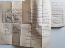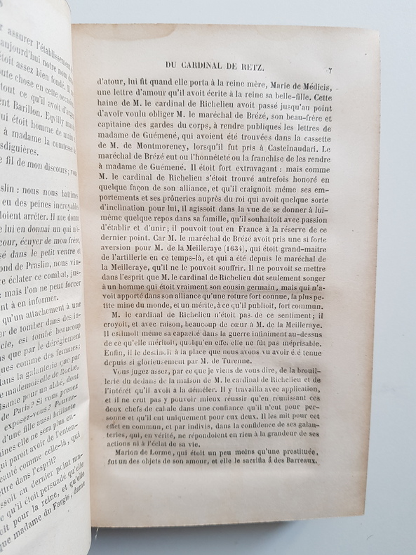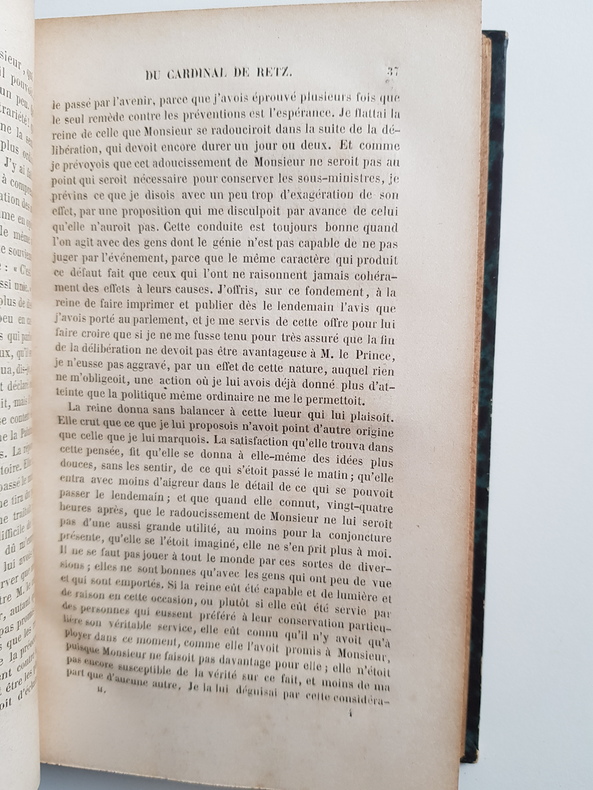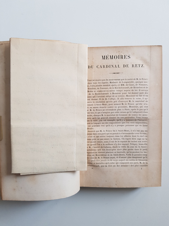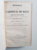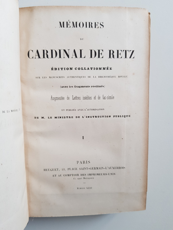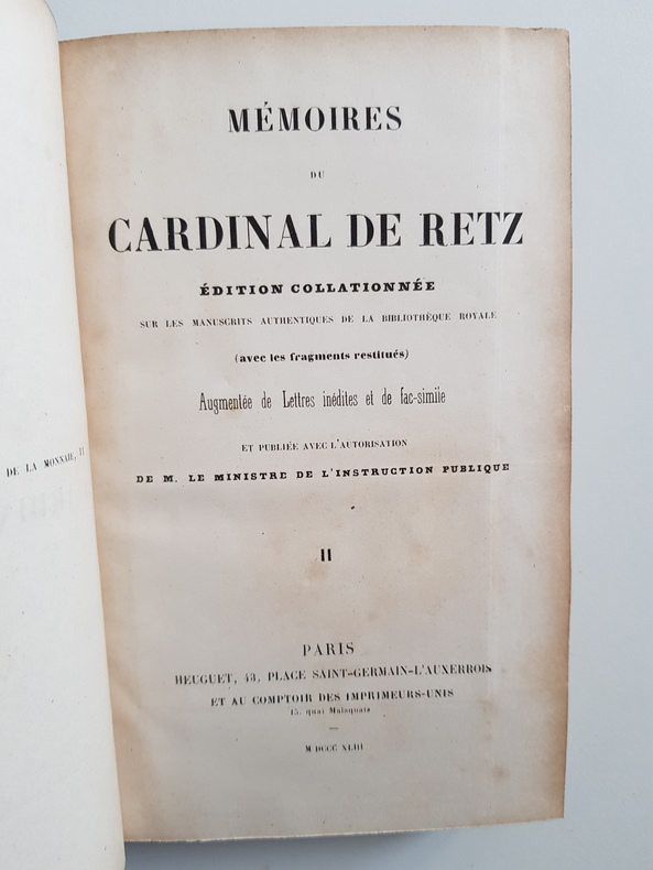Titre : Mémoires du cardinal de Retz – Édition collationnée sur les manuscrits authentiques de la Bibliothèque royale, augmentée de lettres inédites et de fac‑similé (avec les fragments restitués). 2 volumes Auteur : Gondi, Jean‑François Paul (cardinal de Retz) Éditeur : Heguet et au Comptoir des Imprimeurs‑Unis Lieu : Paris Date : 1843 Reliure : Demi‑chagrin vert d’époque, dos lisses ornés de filets et titres dorés, tomaisons dorées, plats marbrés Format : in‑8 (env. 21 cm) Langue : français Particularités : Édition autorisée par le ministère de l’Instruction publique. Comprend un grand fac‑similé dépliant d’une lettre, ainsi que des lettres inédites. Ensemble complet en 2 volumes numérotés I et II État : Bon exemplaire d’époque ; reliures solides, frottements d’usage aux plats et aux coiffes, coins émoussés ; intérieur avec rousseurs et brunissures éparses propres au papier du XIXe siècle ; planche dépliante présente