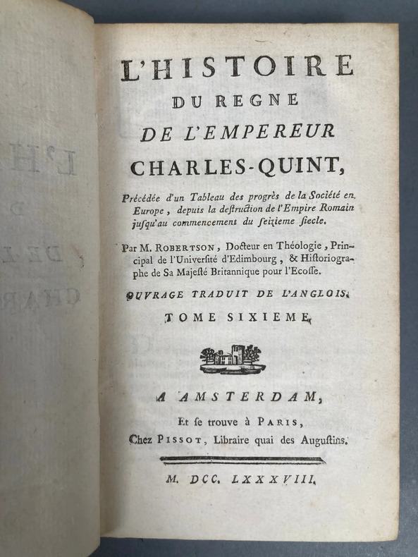 ROBERTSON (William) - Histoire de l'empereur Charles-Quint. Précédée d'un Tableau des progrès de la société en Europe depuis la destruction de l'Empire Romain jusqu'au commencement du seizième siècle. Amsterdam et se trouve à Paris, Chez Pissot, 1788 ., in-12, XVI-270 + 310 + 324 + 370 + 343 + 364 pp. Reliures plein veau marbré de l'époque, dos lisses ornés, tranches peintes, filets sur les plats. Les 6 volumes. William Robertson né en 1721 et mort en 1793 à Edimbourg, universitaire et historien écossais, est pendant trente ans principal de l'université d'Edimbourg. Il est contemporain de Voltaire et de la Révolution Française, il cherche à remplacer l'histoire militaire pour faire apparaitre une histoire des peuples. Bon état.
