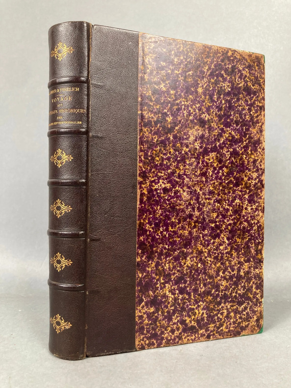 GANIER (Henry), FROELICH (Jules) - Voyage aux châteaux historiques de la chaîne des Vosges. Paris, Berger-Levrault, 1889 ., in-4, VIII + 510 pp + une carte dépliante Reliure demi-chagrin brun, dos orné à 5 nerfs, tranches jaspées.