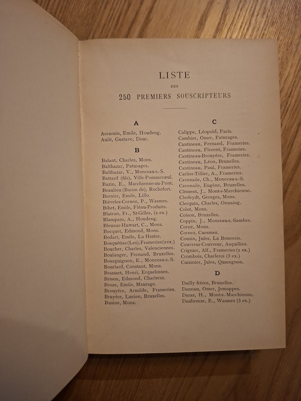 Contactez-nous pour obtenir des photos Rare exemplaire original des Oeuvres choisies en patois de Frameries, publie en 1892 par Leon de Prat. Cet exemplaire comprend : un portrait de l'auteur ; une page de titre illustree ; les Comedies en patois de Frameries ; la liste complete des 250 premiers souscripteurs. Le nom Leon Cantineau apparait sur la page de titre, inscrit d'une elegante ecriture. Il correspond exactement a celui d'un des souscripteurs officiels mentionnes dans la liste. Detail historique interessant : Un certain Leon Cantineau, ne a Frameries en 1861, devint par la suite medecin et conseiller communal a Saint-Gilles (Bruxelles). Sans pouvoir l'affirmer avec certitude, la concordance du nom, de l'epoque et du lieu de naissance rend l'hypothese d'une identification tres plausible. Un bel exemplaire personnel, directement lie a l'un des souscripteurs d'origine de 1892.