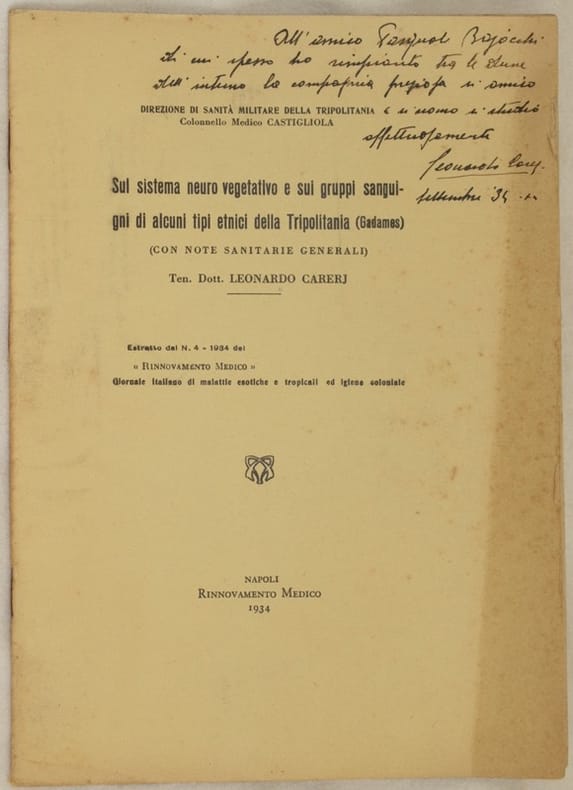 In 8. Dim. 23,5x17 cm. Pp. 24. Interessante pubblicazione del 1934 edito dalla Direzione di Sanità Militare della Tripolitania scritto da Leonardo Carerj sul sistema neuro vegetativo e sui gruppi sanguigni di alcuni tipi etnici della Tripolitania (Gadames). Estratto dal n. 4 1934 del "Rinnovamento Medico" giornale italiano di malattie esotiche e tropicali ed igiene coloniale. All'interno sono presenti quattro foto. Alla fine planche ripiegata con informazioni e risultati sui farmaci utilizzati nella sperimentazione. Dedica autografo dell'autore al piatto anteriore. In ottime condizioni. Copertina editoriale in buone condizioni generali con lievi usure ai margini e dorso. Legatura in buone condizioni. All'interno le pagine si presentano in ottime condizioni con rare fioriture. Piegature marginali.Interesting pamphlet of 1934 edited by Direzione di Sanità Militare of Tripolitania written by Leonardo Carerj about neuro vegetative system and about blood groups on some ethnical groups of Tripolitania (Gadames). Extract n. 4 1934 of the "Rinnovamento Medico" italian magazine of esotical and tropical deseases and colonial hygiene. Inside there are four photoes. At the end folded planche with information and results with usage of drugs used in research. Autographed dedication in the front plate. In very good conditions. Editorial cover in good general conditions slightly worn in the edges and spine. Binding in good conditions. Inside pages are in very good conditions with occasional foxings. Foldings in the edges.