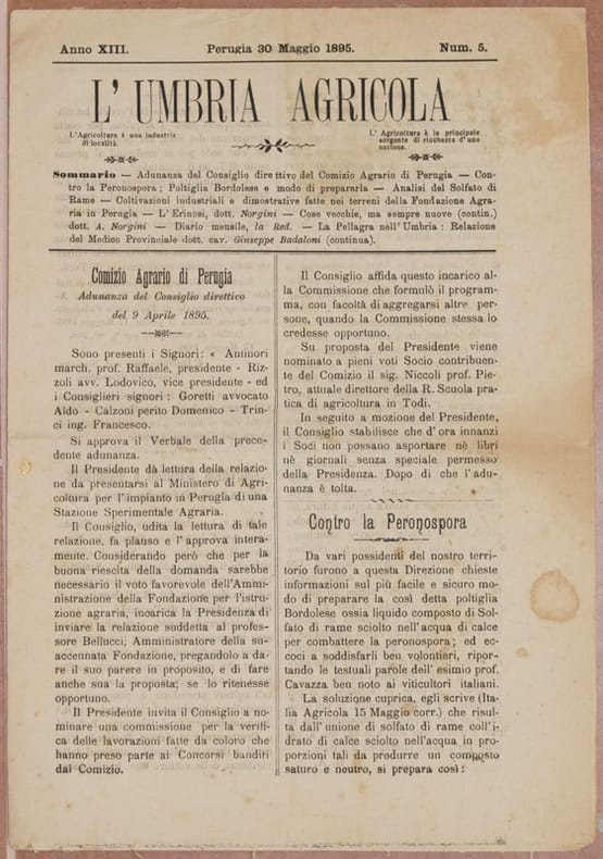 In 4. Dim. 28x19,5 cm. Pp. da 65 a 80. Numero del 30 maggio 1895 de "L'Umbria agricola", rivista bisettimanale di economia rurale diretta da Riccardo Gamba. La rivista conteneva numerosi articoli di agricoltura e allevamento, molti di interesse locale. In questo numero: Adunanza del Comizio agrario di Perugia, Contro la Peronospora: Poltiglia bordolese e come prepararla, Analisi del solfato di rame, Coltivazioni industriali e dimostrative fatte nel terreni dalla fondazione Agraria in Perugia, La pellagra nell'Umbria ecc... Brossura editoriale assente. Brossura editoriale in buone condizioni generali con usure e parti mancanti ai margini e dorso. Piegatura orizzontale. Legatura assente. Pagine in buone condizioni con rare fioriture, ancora unite tra loro. Piegature ed usure marginali. Number of the 30th of july 1893 of "L'Umbria agricola", biweekly magazine of rural economy directed by Riccardo Gamba. The magazine contained different articles of agriculture and breeding, many of them of local interest. In this number: meeting of Comizio agrario di Perugia, Against Peronospora: Bordeaux mixture and how to prepare it, Analisis of copper sulphur, Industrial and demonstrative cultivations made in soils by fondazione Agraria in Perugia, pellagra in Umbria ecc... Editorial cover is missing. Editorial cover in good general conditions with wearings and missing parts in the edges and spine. Horizontal folding. Binding is missing. Pages are in good conditions with foxings, still bound together. Foldings and wearings in the edges.