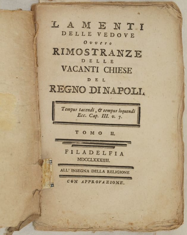 In 8. Dim. 20,5x13,5 cm. Pp. 199+(1). Edizione del 1784 di questa interessante opera sul Regno di Napoli di autore anonimo ma di Padre Ottavio Maria Chiarizia (1729-1824) passato alla storia come il precursore dell'idea dell'Unità Europea.<BR><BR> <BR><BR>L'opera era composta da due volumi, siamo purtroppo in possesso solo del secondo tomo.<BR><BR>L'opera è una raccolta di sette rimostranze in cui l'autore lamenta la mancanza di vecovi e l'abbandono in cui erano state lasciate le Chiese del Regno di Napoli.<BR><BR>In questo tomo rimostranza per i Reali Sovrani delle Sicilie, Arcivescovi Vescovi e Prelati del Regno di Napoli, Avvocato della Corona.<BR><BR> <BR><BR>Luogo di stampa falso, probabilmente Napoli (Cfr. Parenti).<BR><BR>In barbe.<BR><BR>In discrete condizioni ma completo di tutte le pagine. <BR><BR> <BR><BR>Copertina morbida coeva in mediocri condizioni generali con usure e parti mancanti ai margini e dorso. Piatto anteriore quasi del tutto staccato e dorso assente (vedere foto). Legatura in discrete condizioni con rotture. All'interno le pagine si presentano in buone condizioni con rare fioriture.