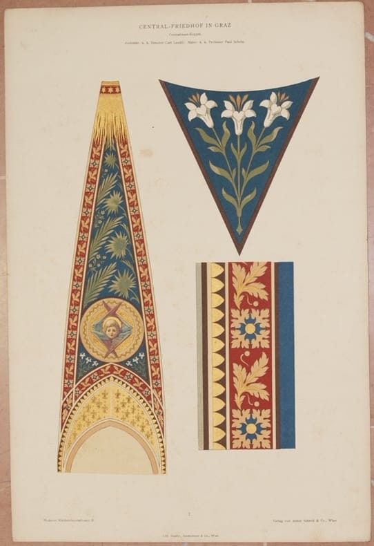 Bella litografia del 1890 circa tratta dal "Moderne Kirchendecorationen" edito da Verlag von Anton Schroll &Co. Wien. L'incisione mostra una decorazione eseguita dall'Architetto Carl Luzil e dal Professore Paul Scholtz nel cimitero di Gratz. In ottime condizioni, qualche fioritura.TECNICA: Litografia DIMENSIONI FOGLIO: cm 44x29,5 DIMENSIONI INCISIONE: cm 32,5x20 EPOCA: 1890 circa CONDIZIONI: Ottime condizioni, qualche fioritura. Beautiful lythography of 1890 circa taken from "Moderne Kirchendecorationen" edited by Verlag von Anton Schroll &Co. Wien. The print show a decoration made by Architect Carl Luzil and by Professor Paul Scholtz in the cemetery of Gratz. In very good conditions, some foxings. TECHNIQUE: Lytography PAGE SIZE: cm 44x29,5 PRINT'S SIZE: cm 32,5x20 PERIOD: 1890 circa CONDITION: very good conditions with some foxings<BR>